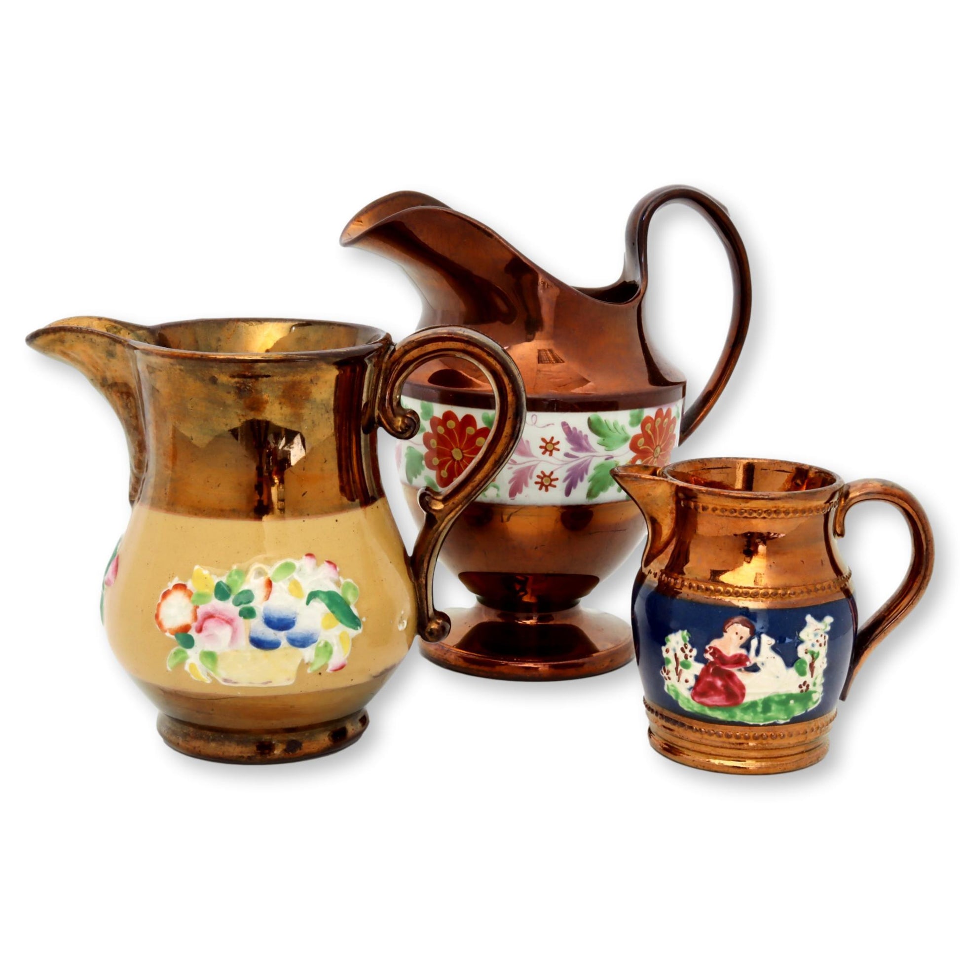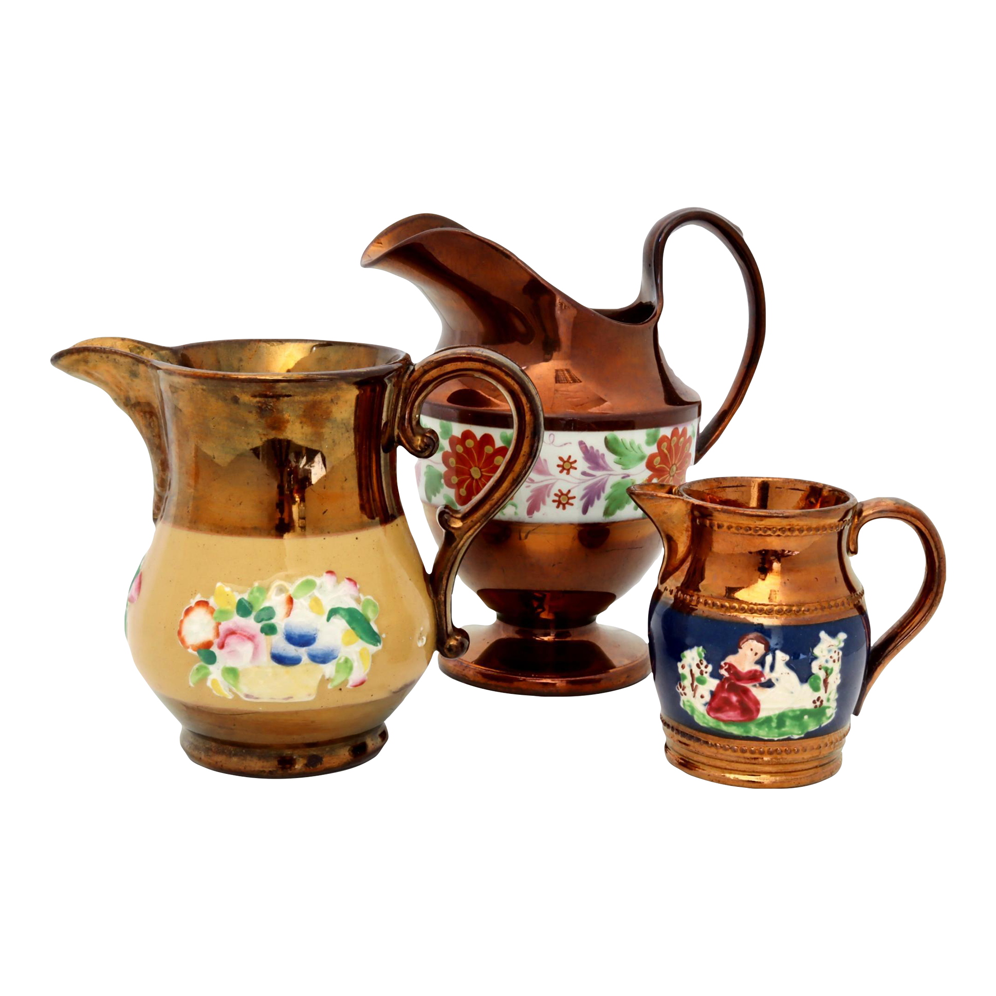 Delve into the rich heritage of English craftsmanship with this exquisite collection of copper lustre pitchers from circa 1880. Each piece showcases vibrant enamel detailing, bringing to life traditional floral motifs and pastoral scenes. Perfect for collectors and enthusiasts alike, these pitchers embody the meticulous artistry of the era and serve as functional pieces of art for any home. Unsigned.