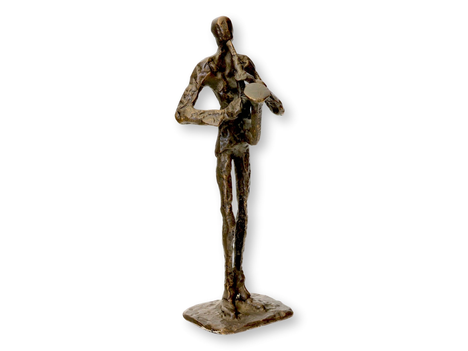 Hand-cast bronze sculpture depicting a jazz musician mid-performance, holding a saxophone with expressive, abstracted form. The elongated figure and rough-hewn surface capture movement and emotion reminiscent of mid-century modernist design, evoking influences of Giacometti and postwar bronze studies. Finished in a rich dark patina, this piece brings artistic energy and sophistication to a bookshelf, console, or curated art collection.