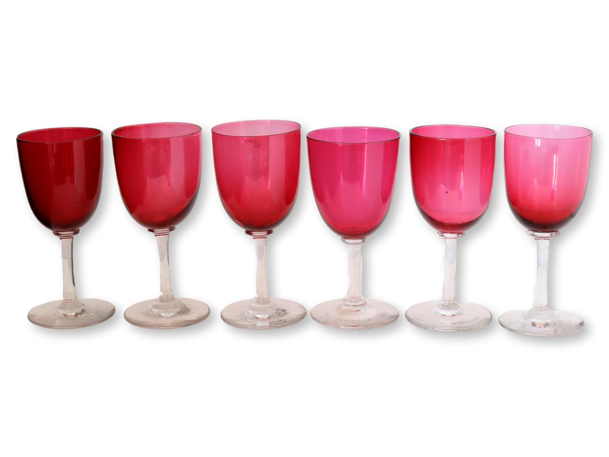 A luminous set of six short-stemmed cranberry wine glasses, hand-blown in richly saturated hues that subtly vary in tone and shape — hallmarks of 19th-century English craftsmanship. Each glass has a generous bowl and modern proportions, making them just as perfect for craft cocktails or champagne coupes as for wine or cordials.