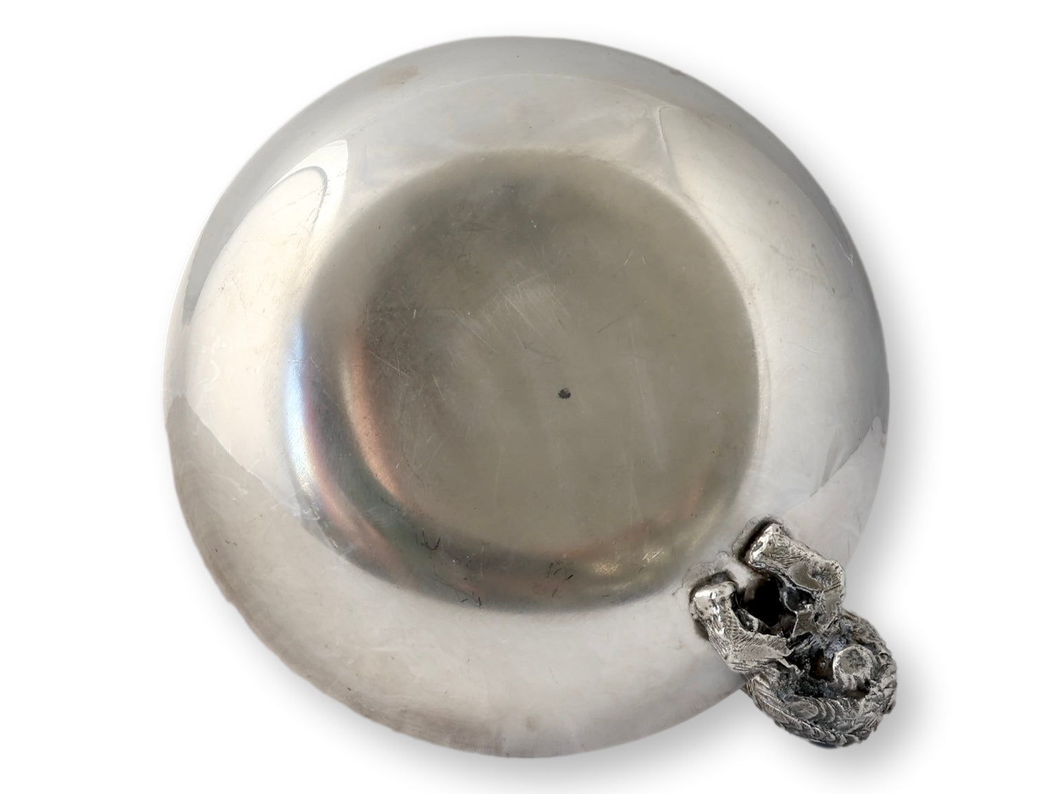Charming English silver-plated trinket or coin dish featuring a finely detailed owl perched at the rim. Likely mid-20th century, this whimsical piece is unmarked but well-crafted, with light surface wear consistent with age. A delightful catch-all for bedside or entry table, perfect for holding rings, coins, or cufflinks. A wise choice for collectors or lovers of unique animal-themed silver.