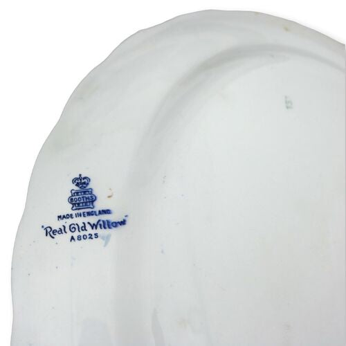 Classic midcentury English transferware platters in the timeless “Real Old Willow” pattern by Booths, featuring cobalt blue and gold trim. This duo includes both medium and large platters, perfect for serving or display. Rich with traditional Chinoiserie motifs and marked on the reverse.