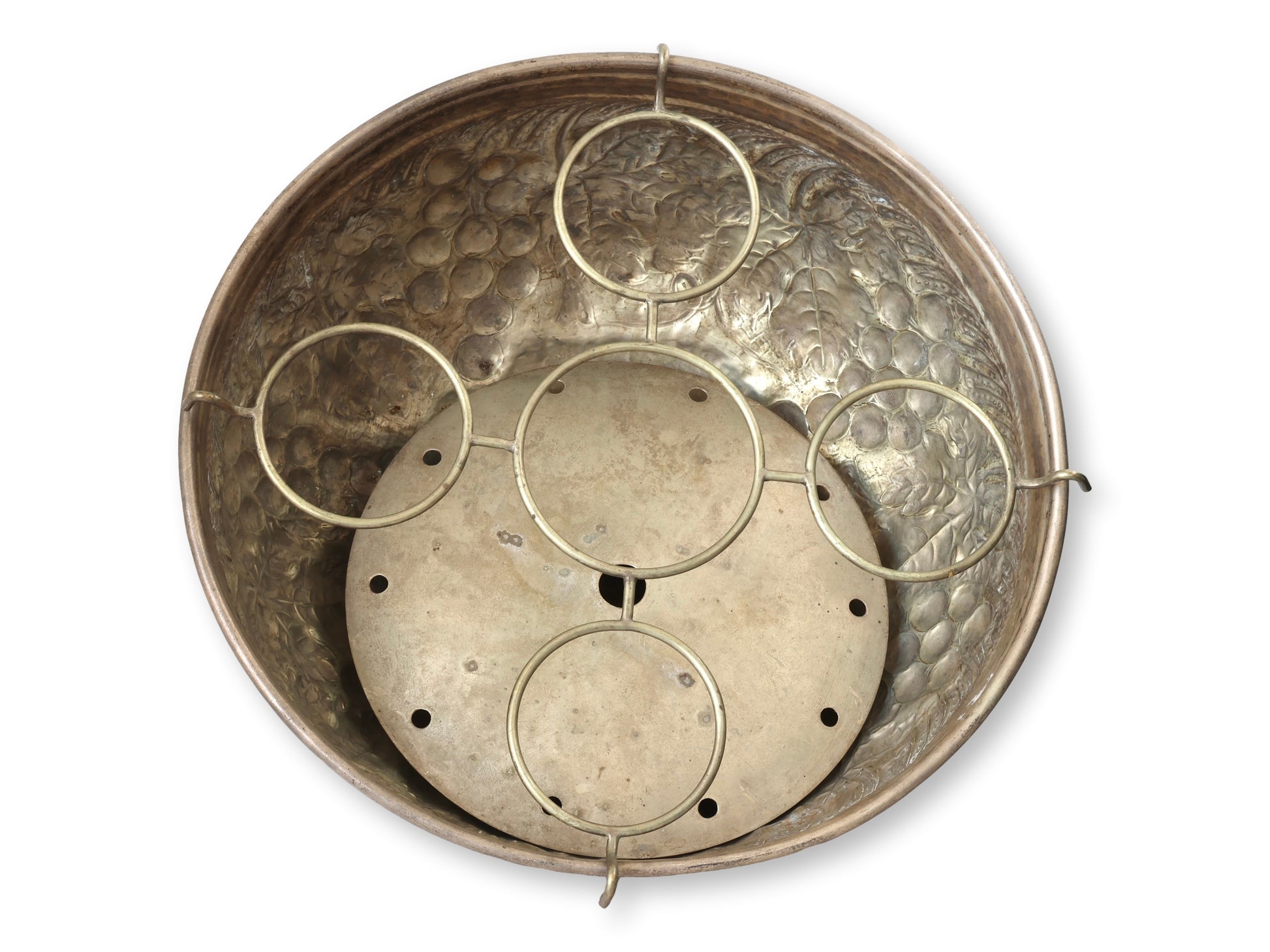The interior retains its original brass insert with five bottle rings and a central drip plate, allowing it to hold multiple bottles securely while maintaining impeccable presentation. The silver surface displays a warm, natural patina with areas of oxidation and tarnish, enhancing its depth and authenticity. A statement piece that moves effortlessly from bar to buffet, where refinement and presence matter most.