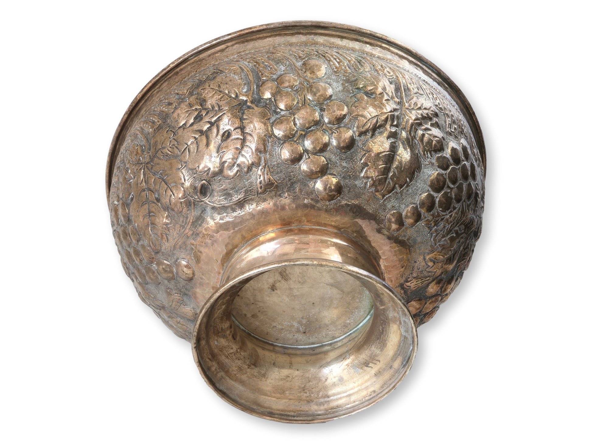 An impressive, large-scale vintage silverplate champagne and wine cooler designed for grand entertaining and timeless display. This beautifully detailed piece features repoussé grape and vine motifs across its body and rim — a nod to the classical elegance of 19th-century wine service traditions, reinterpreted through a midcentury lens.