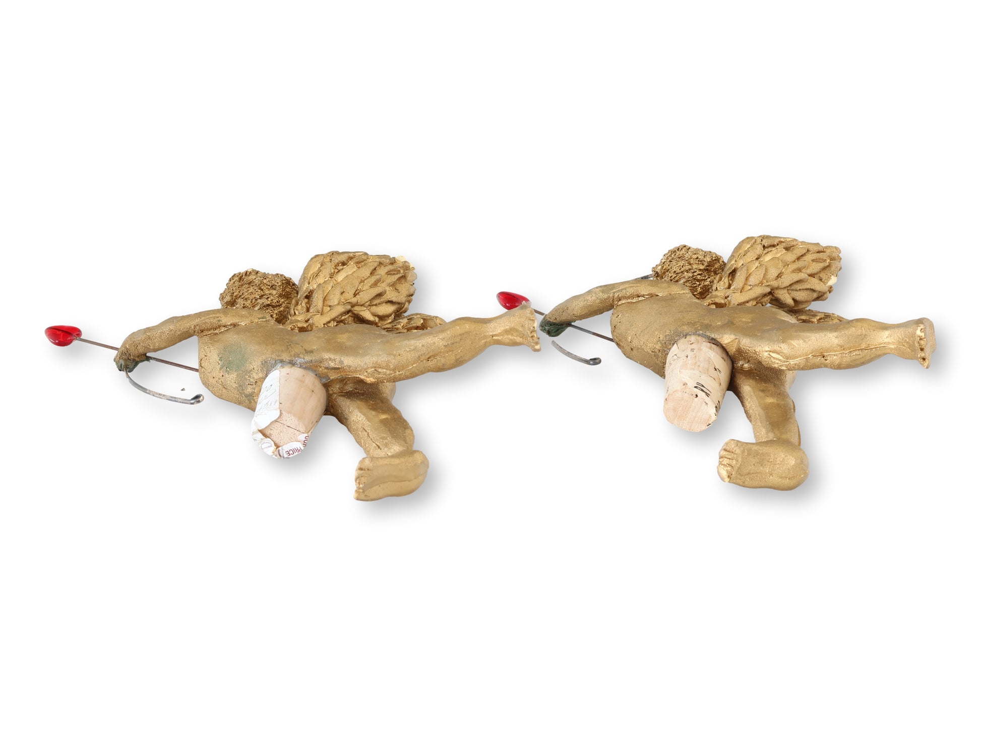Charming pair of vintage Pottery Shack Laguna Beach cherub bottle stoppers, each modeled as a gilt cupid in flight with a heart-tipped arrow. Handcrafted with sculpted wings, wire bows, and cork bases, these whimsical creations were sold through The Pottery Shack—Laguna Beach’s beloved coastal landmark until its retail closure in 2004. A romantic and collectible nod to California’s mid-century artisan spirit.