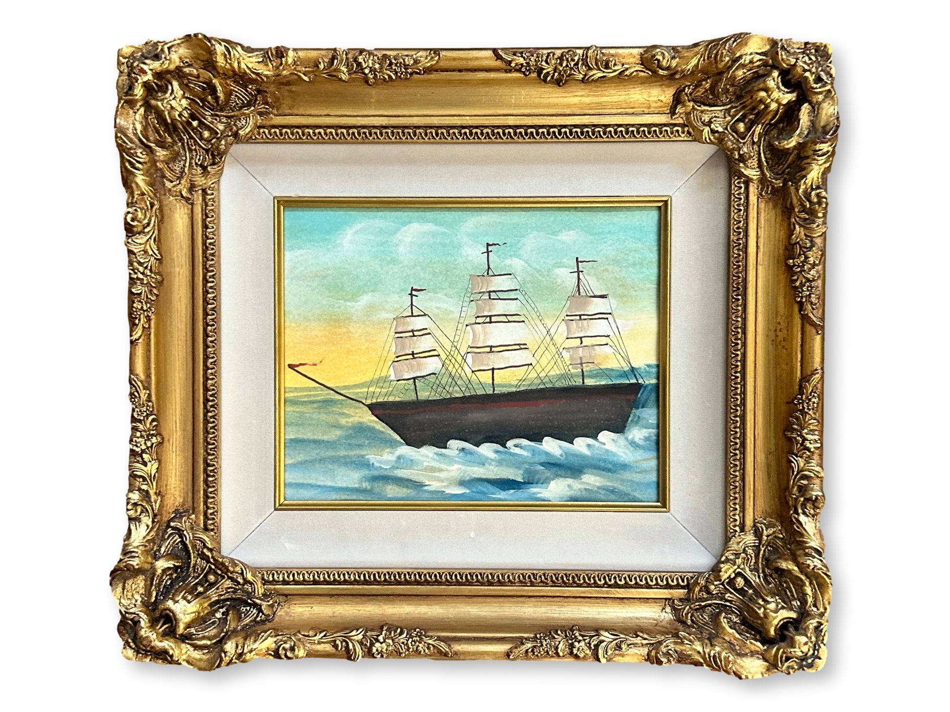 A stunning Folk Art painting of a sailing ship cutting through the waves, set against a serene sky in soft pastel tones. The bold lines and vibrant details evoke the spirit of nautical adventure and craftsmanship. Encased in an ornately carved gold-tone frame, this piece makes a grand statement, perfect for lovers of maritime art or those looking to add a touch of classic elegance to their decor. Unsigned.