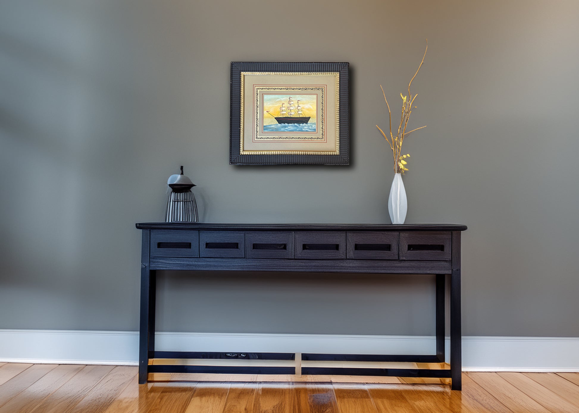 A striking Folk Art painting of a majestic ship navigating the open sea, set against a warm, golden sky. The bold colors and detailed lines bring this nautical scene to life, evoking a sense of adventure and history. Beautifully custom framed with layered matting and a textured black and gold frame, this piece is a perfect addition for collectors or lovers of maritime-inspired decor. Unsigned.