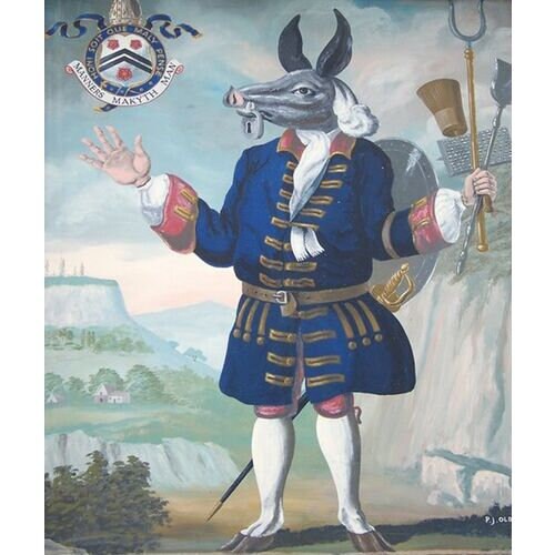 English Folklore figure of the "Trusty Servant" doorknocker. It is a figure, part man, part pig, part deer, and part donkey; with a padlock on his mouth, and various other symbols in his hands and about his person, the whole signifying a most valuable character." The original painting of the "Trusty Servant" hangs in Winchester College in England (see photo of painting by artist John Hoskins in 1579).
