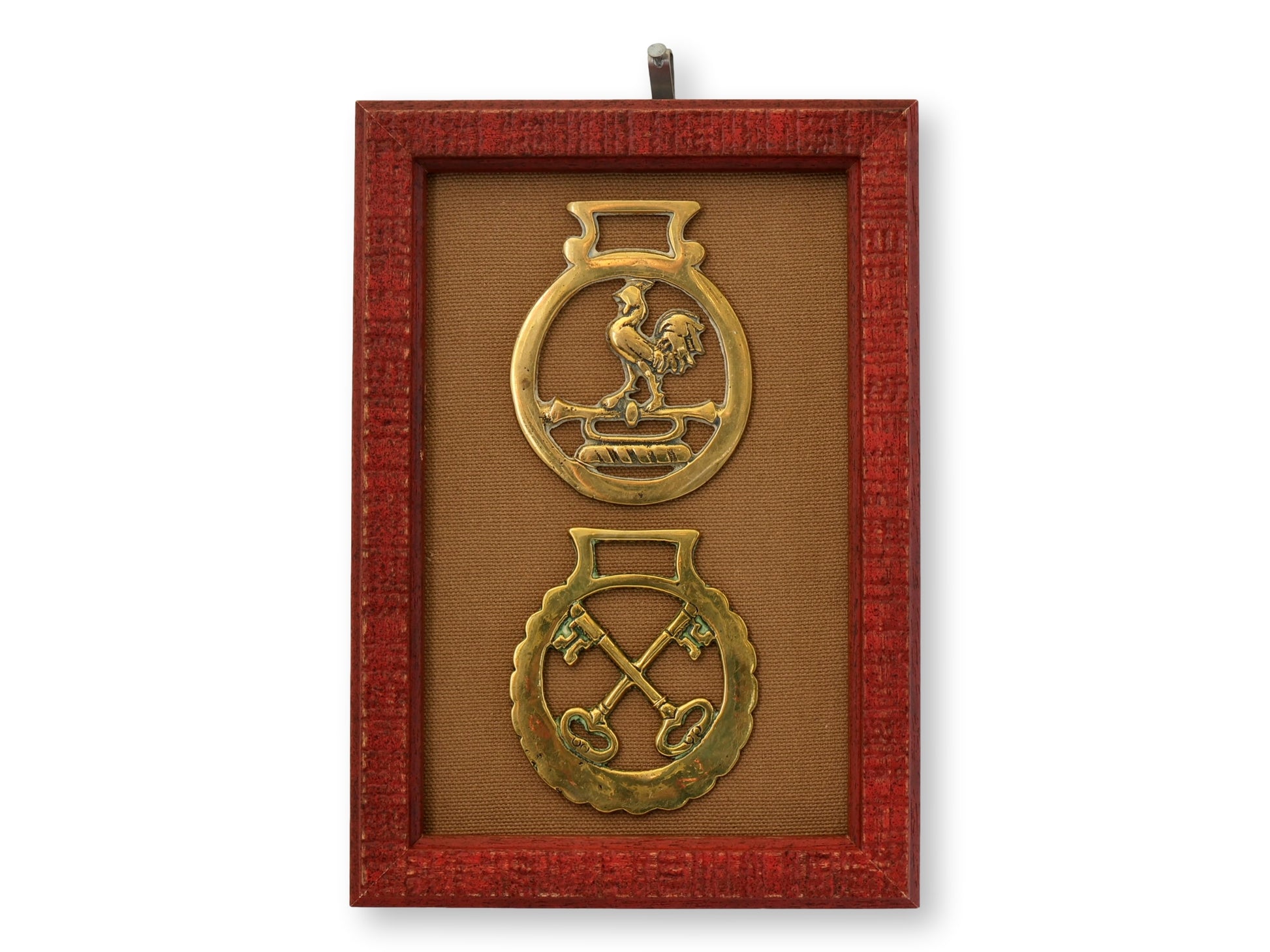 Framed Antique English Horse Brasses – “Cocky” Rooster & Key