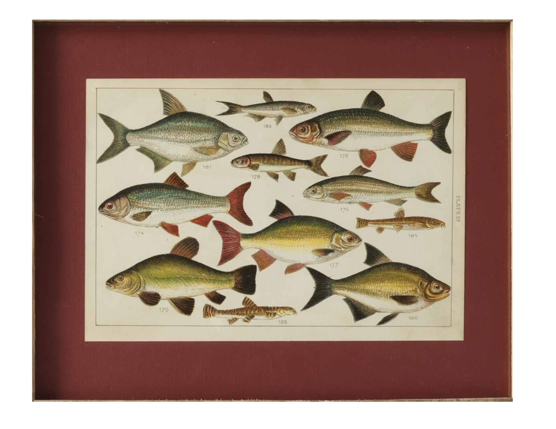 A vibrant 19th-century chromolithograph showcasing freshwater fish species in stunning scientific detail. Originally printed as part of a marine or freshwater biology text, this plate features expertly illustrated specimens, each carefully labeled and composed for visual clarity. A masterclass in antique natural history illustration, printed in rich chromatic tones that still hold beautifully today.