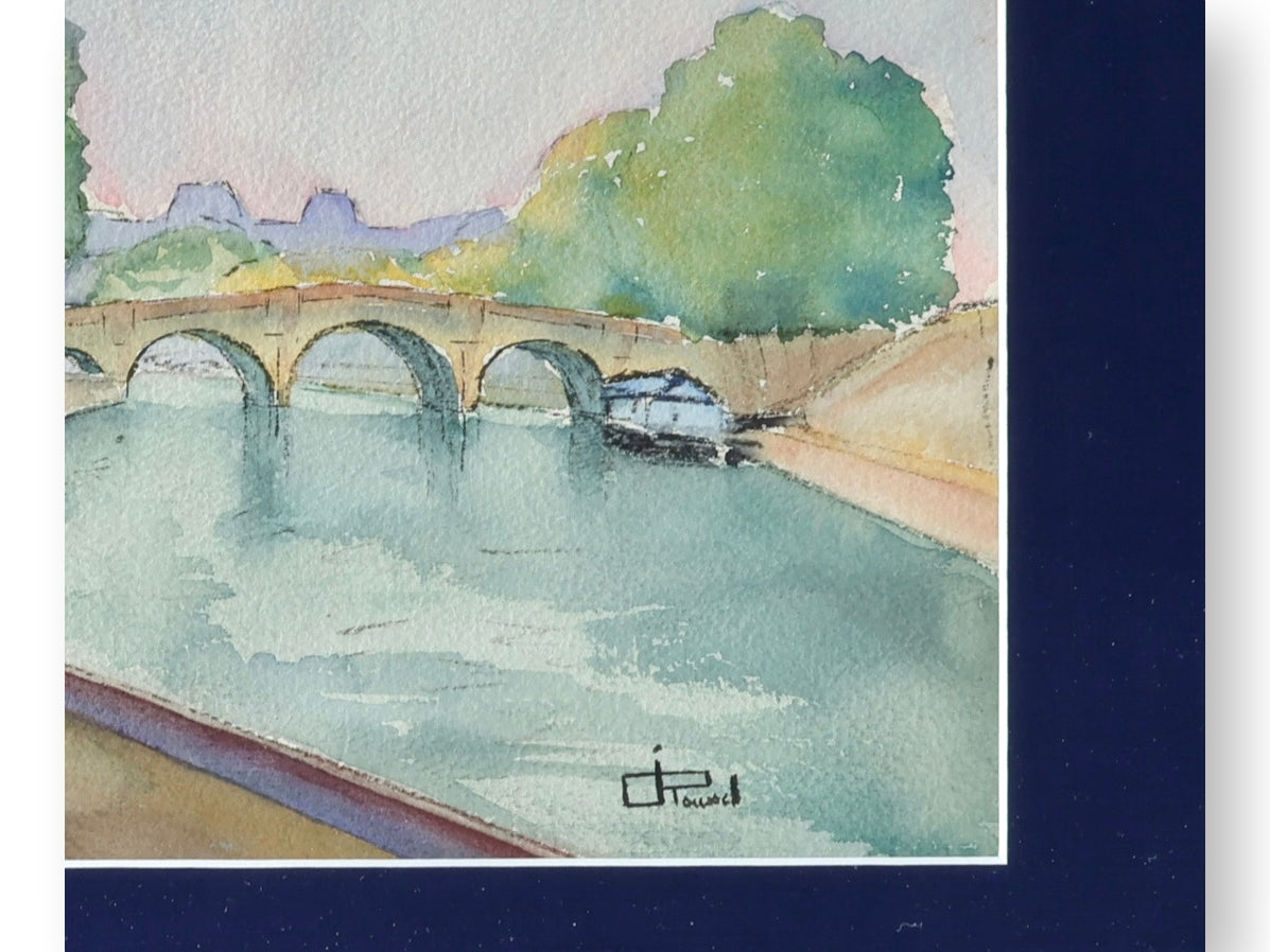 Charming midcentury watercolor capturing a peaceful Parisian river scene, complete with a stone bridge, tree-lined banks, and soft pastel hues. The gentle brushwork and tranquil palette reflect the serenity of a quiet afternoon on the Seine. Double matted in navy and framed in giltwood, this signed piece brings understated elegance and European charm to any space.