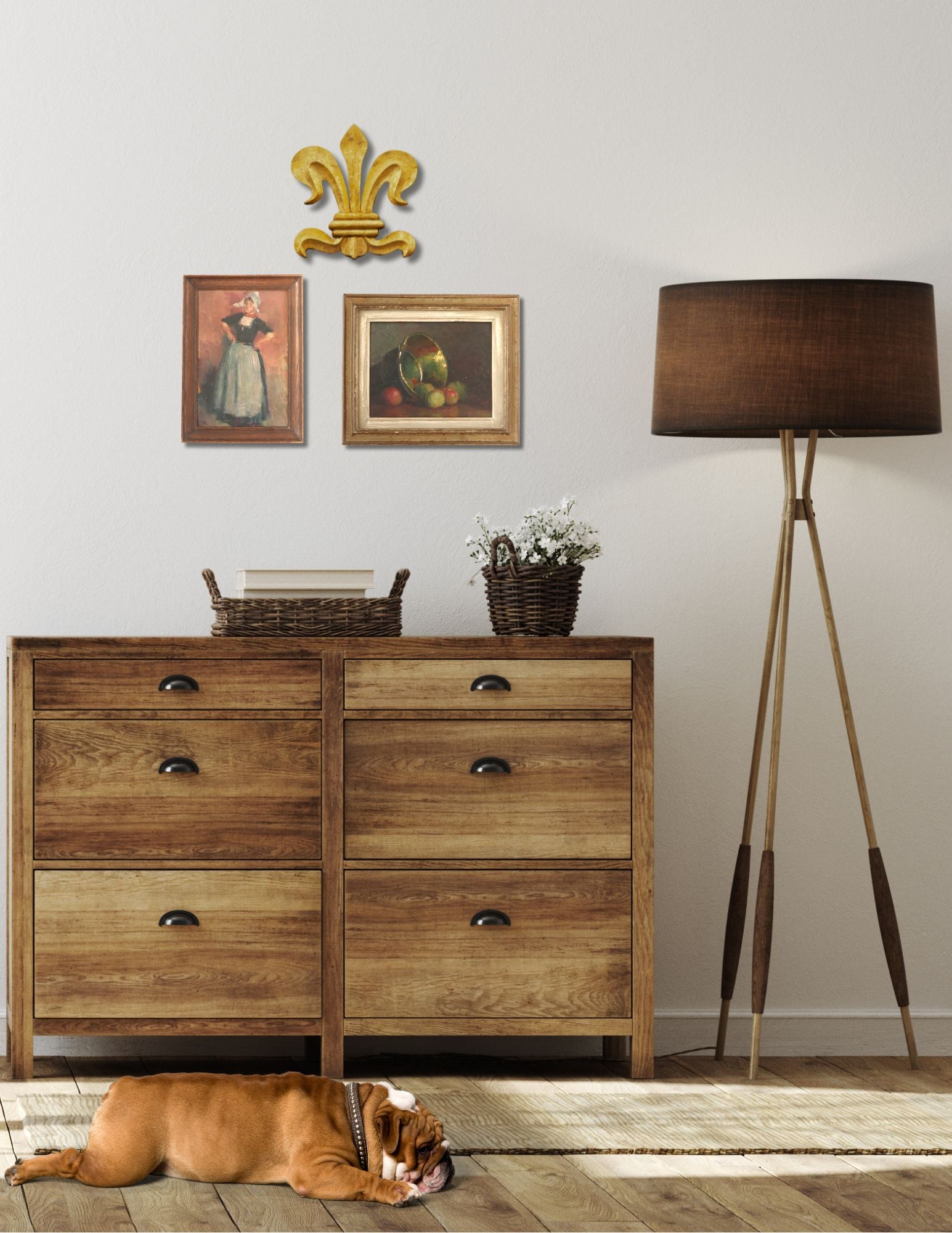 Charming country kitchen still life of apples spilling from a brass bucket, painted in the early 20th-century French school style. Warm light glows across the bucket’s reflective surface, enhancing the rich red and green of the fruit against a dark backdrop. Evoking the abundance of the autumn harvest and rustic simplicity, this timeless piece brings painterly warmth and farmhouse charm to kitchen or dining spaces. Framed as found, with light wear consistent with age.