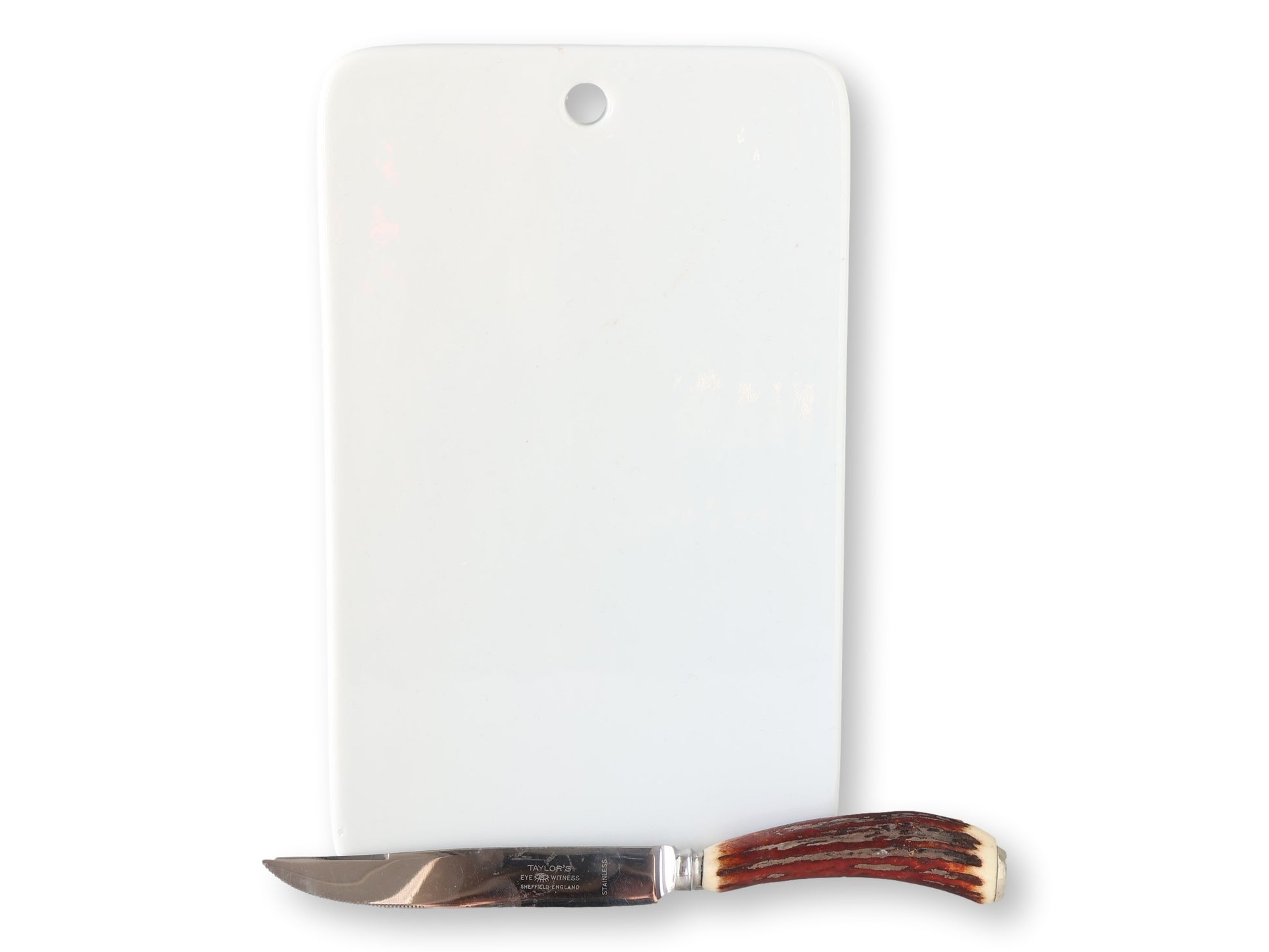 French white porcelain cheese board paired with a classic cheese knife featuring a natural stag horn handle. The simple rectangular board is elegant and timeless, while the knife brings a rustic edge with its antler grip—perfect for entertaining. A refined mix of materials that balances French minimalism and English craftsmanship. Knife has makers mark on it: dimensions: cutting board 9.25" x 5.75" x .25": knife 8.25" x 1.0" x .5"