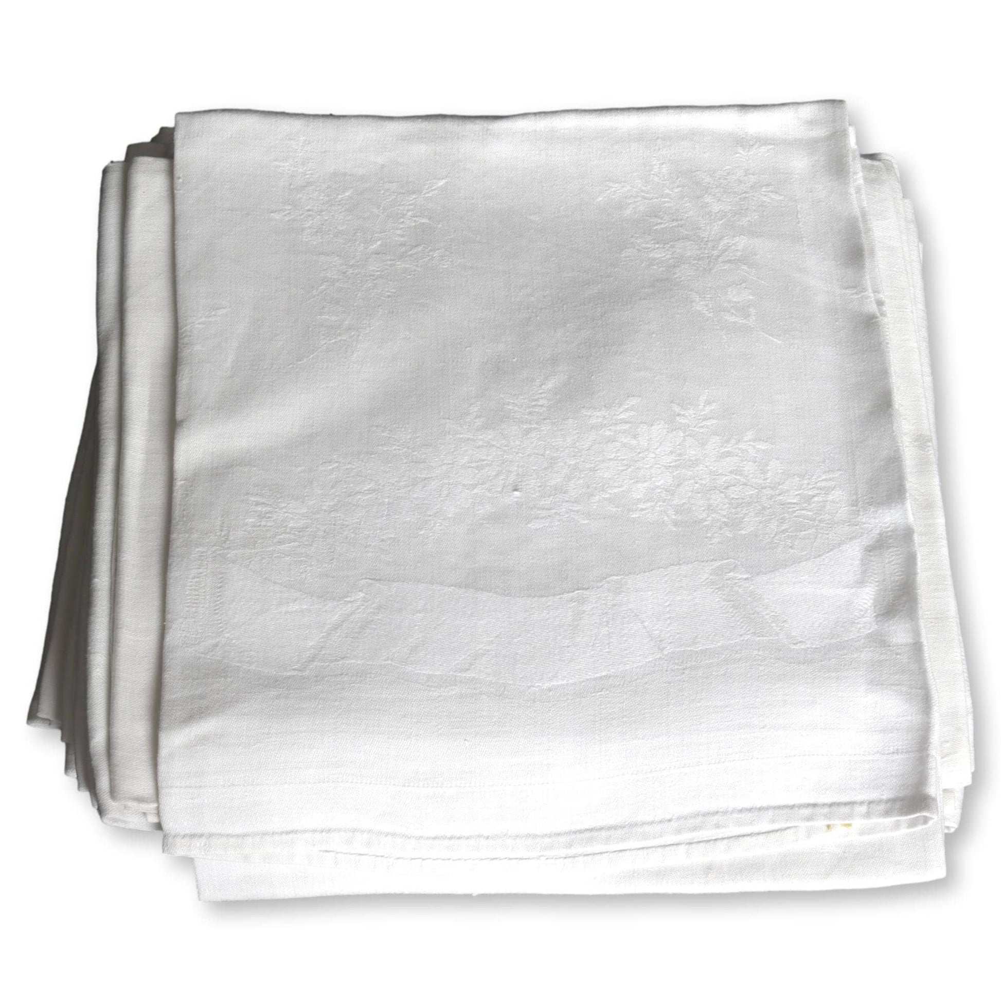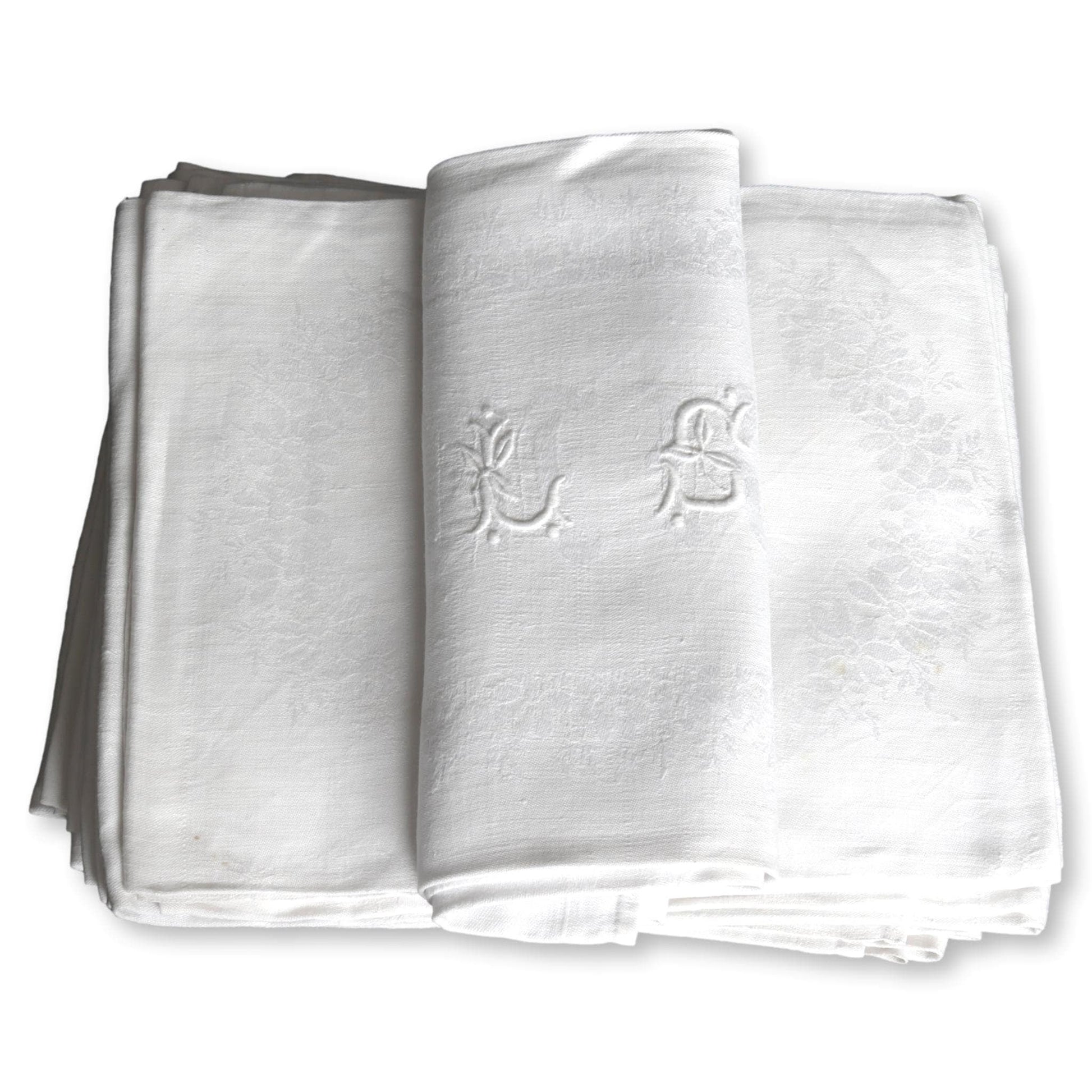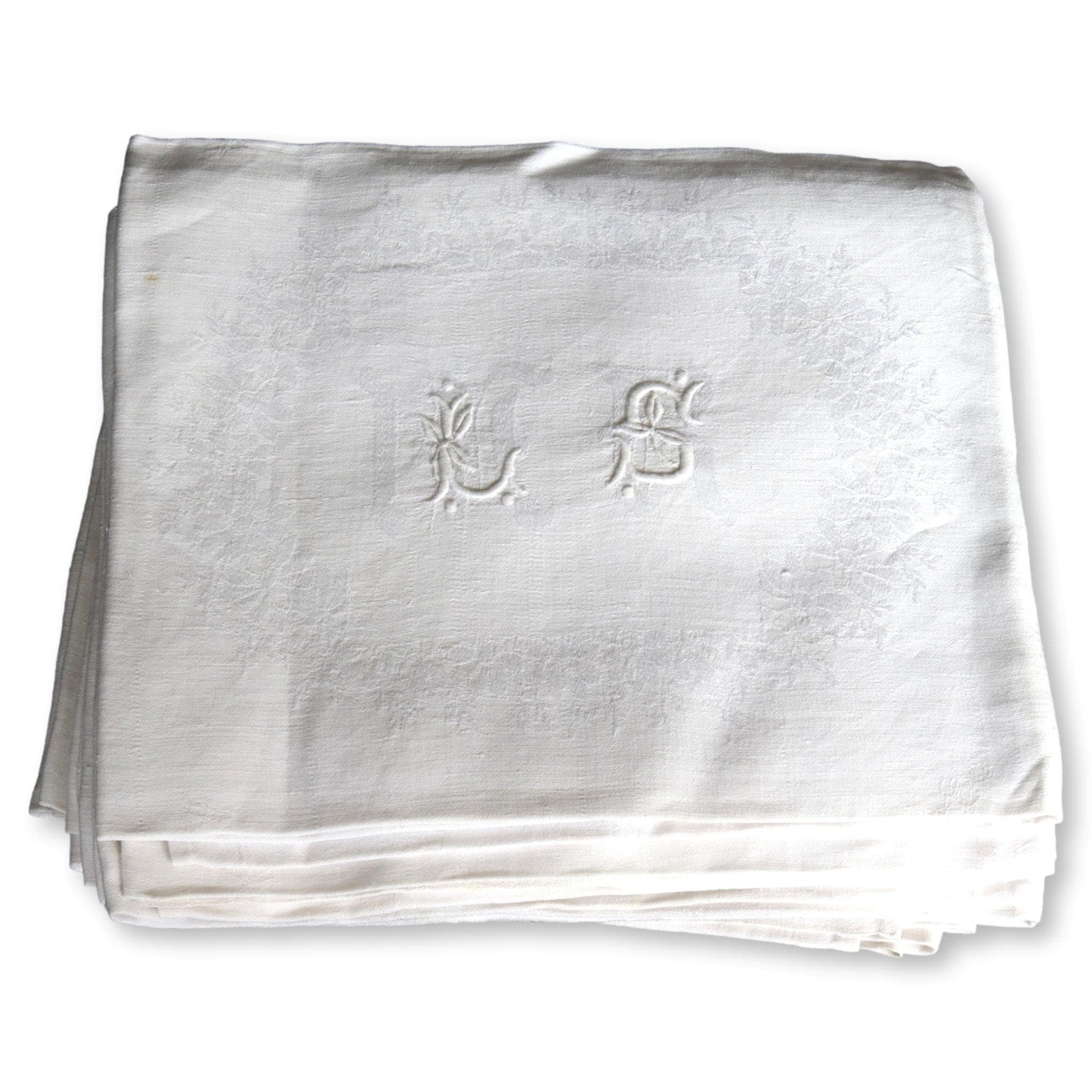 Set of twelve antique French monogrammed "LS" dinner napkins. Oversized Euro style. Strong pattern on pattern damask. No maker's mark.