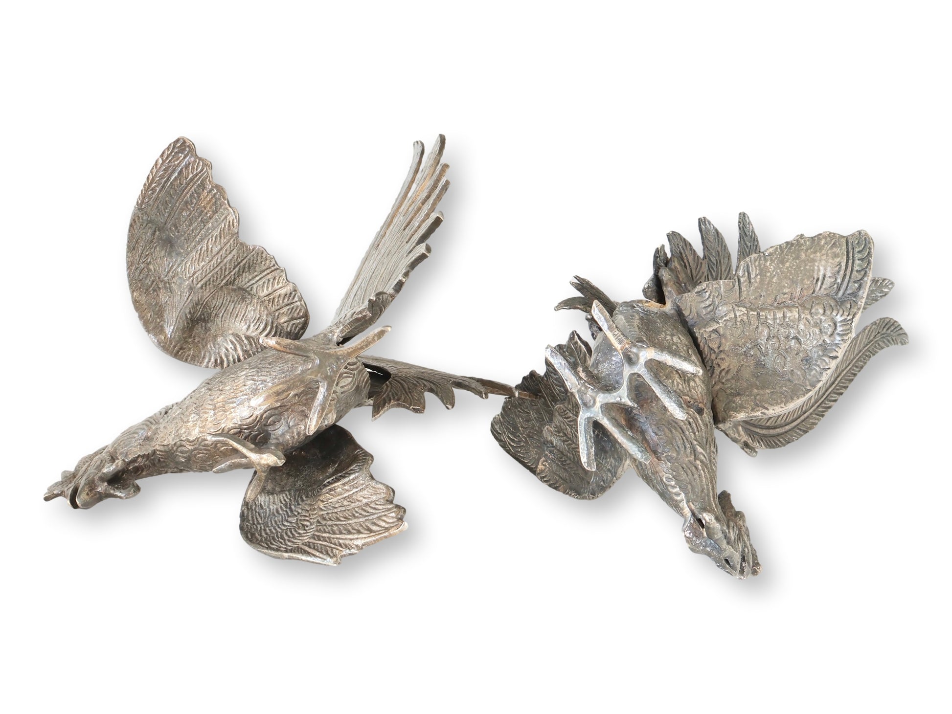 A pair of French silver-plate rooster table ornaments, depicting their past love for cock fighting. With the Gallic rooster (le coq gauloi) being the national symbol of France, the rooster has been a highly collectible staple in homes for hundreds of years. These ornaments famously adorn French table settings in the city and the country. This pair is from France, the whimsical birds were produced in several European countries and the UK. Unsigned.