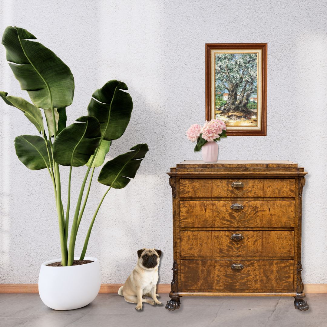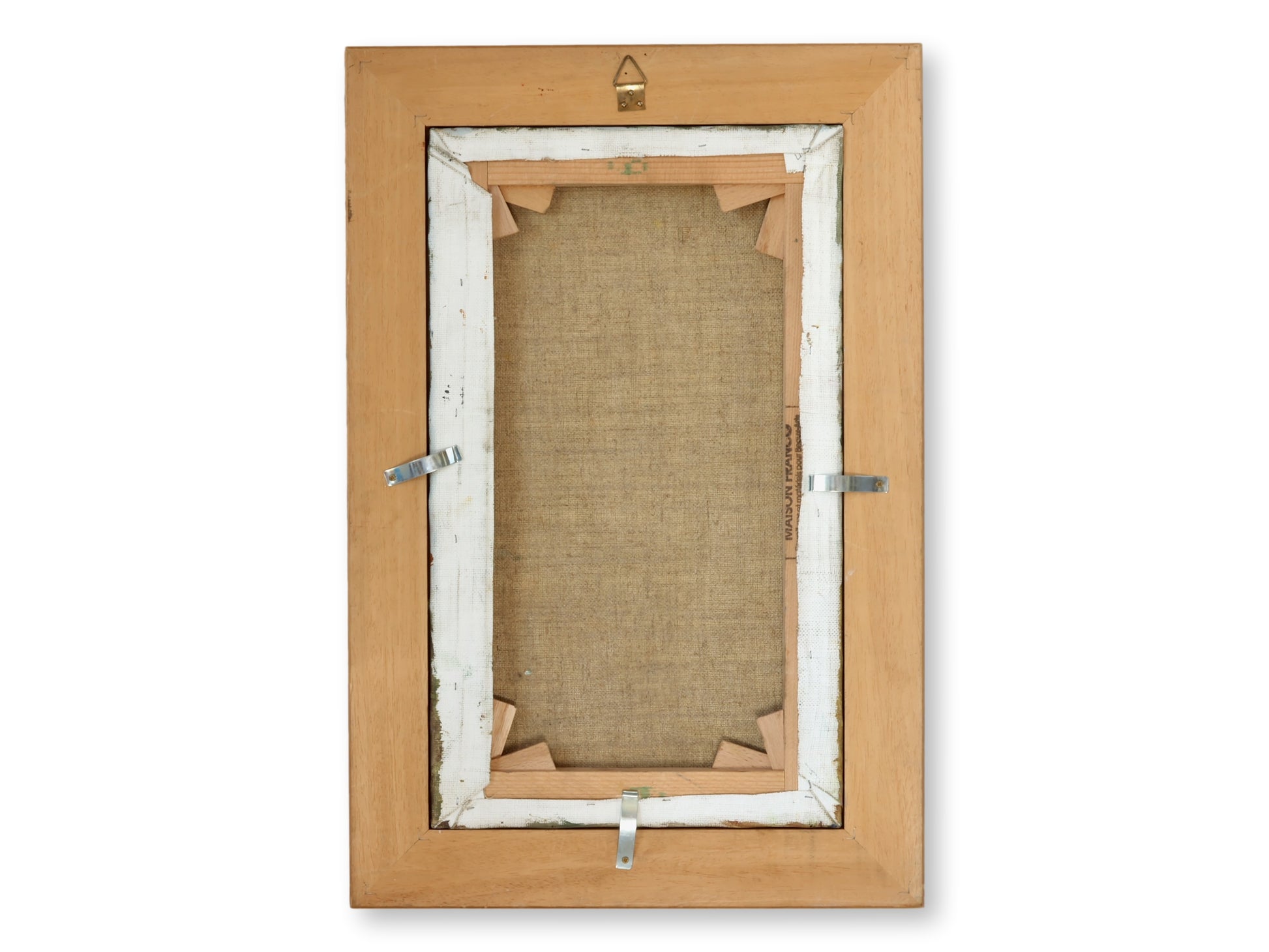 French oil painting of a flowering tree, its thick trunk and twisting branches suggesting centuries of growth. Painted in bold, impasto strokes, the silvery foliage shimmers against a bright Provençal sky, evoking the warmth and beauty of the French countryside. The textured surface adds vibrancy and depth, while the rustic setting captures both strength and delicacy in nature. Framed as found, with light wear consistent with age.