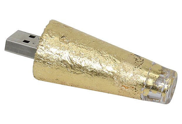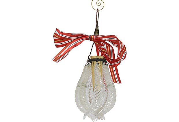 Antique French illuminated chandelier ornament adorned with antique ribbon. At some point, these were probably a part of a large chandelier, they have been transformed into ornaments by a Paris Flea Market craftsman. Made up of cut crystal leaves. LED light is easily removed and rechargeable with a standard USB slot/charger (see photo). No maker's mark. Light wear.