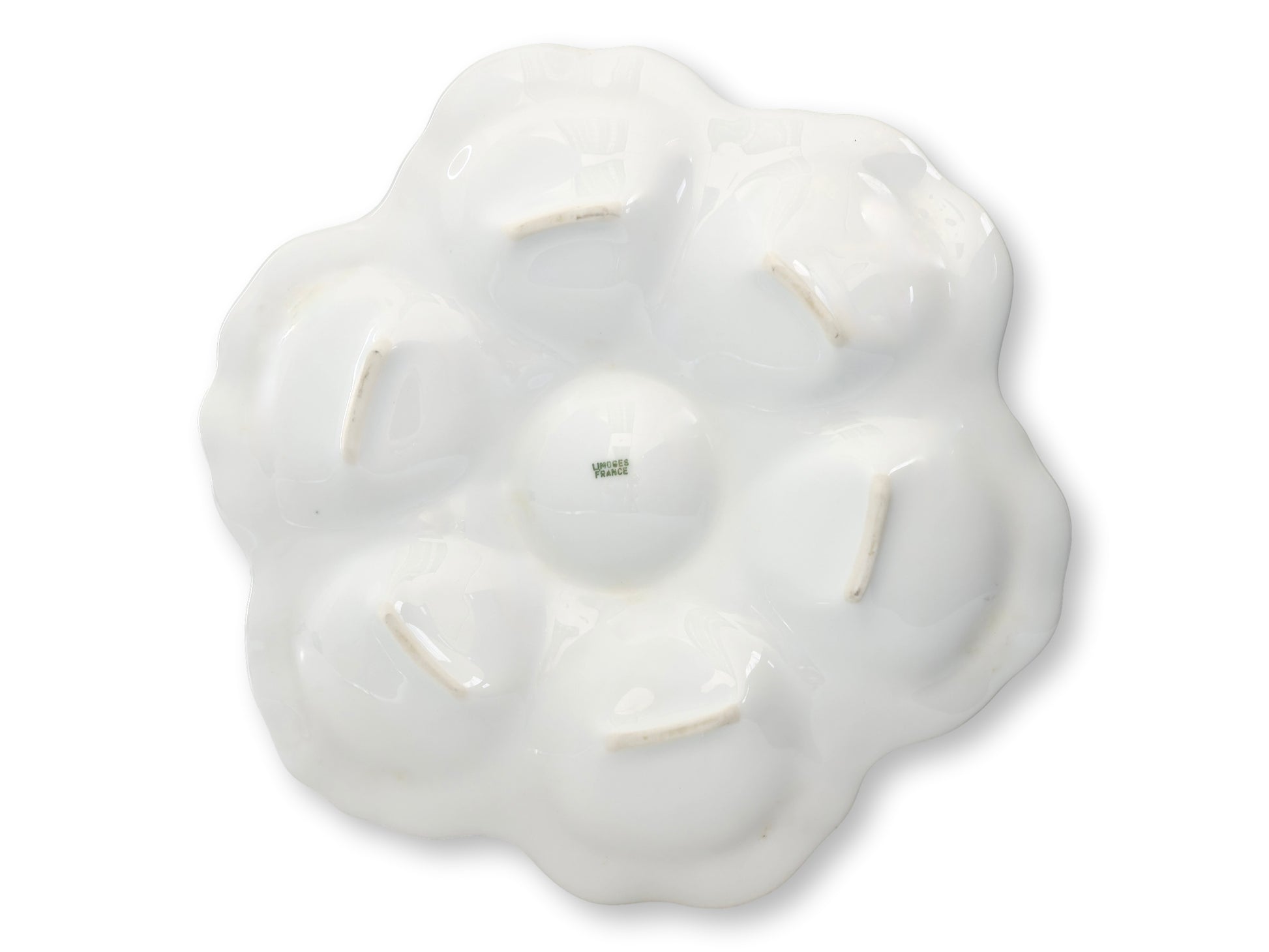 Set of eight Limoges oyster plates in crisp white porcelain, each molded with six scalloped wells surrounding a central sauce compartment. The glossy glaze and refined French craftsmanship highlight Limoges’ reputation for understated elegance, making these plates as timeless as they are versatile.