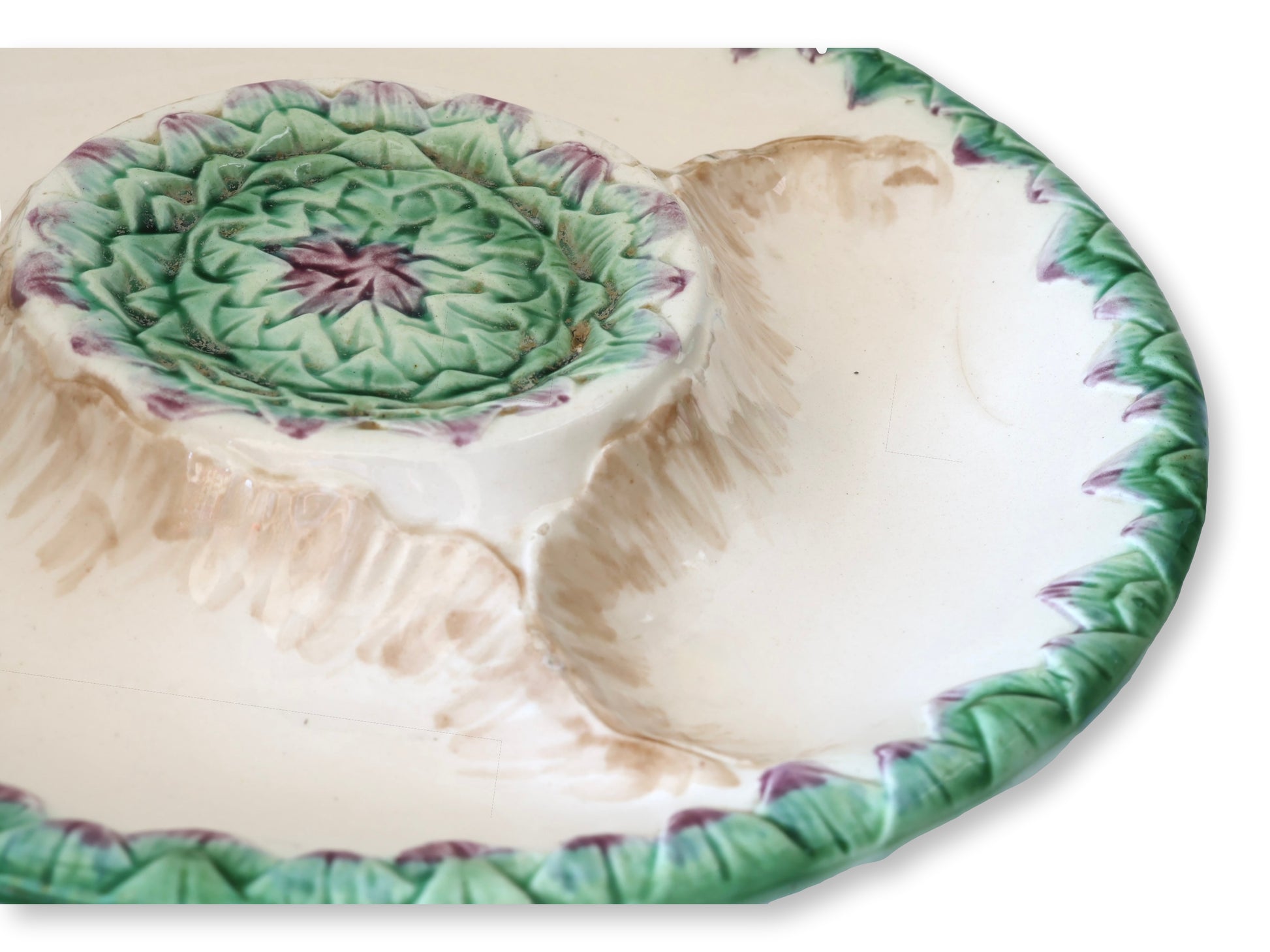 Set of four French Longchamp Terre de Fer majolica plates, molded with artichoke centers and scalloped rims glazed in fresh green and cream with accents of plum. These finely crafted faience plates embody the refinement of late-19th century French tableware — the kind that wouldn’t look out of place at a Riviera luncheon à la Princess Margaret.