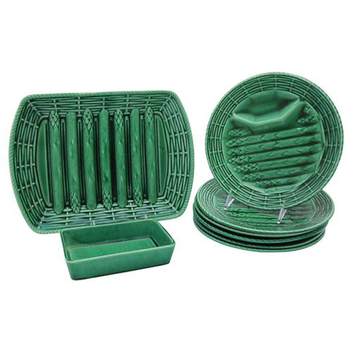 Elevate your dining experience with this exquisite early 20th century French Majolica asparagus set by Sarreguemines. This comprehensive set includes six asparagus plates, a large serving platter, and a matching butter dish, all finished in a vibrant, lush green glaze. The plates and platter are designed with specialized grooves to cradle the asparagus, enhancing both the presentation and enjoyment of your meal. The intricate details and rich color of the set reflect the classic artistry of French Majolica, making it a stunning addition to any table or collection. Perfect for entertaining or as a beautiful display in your home.