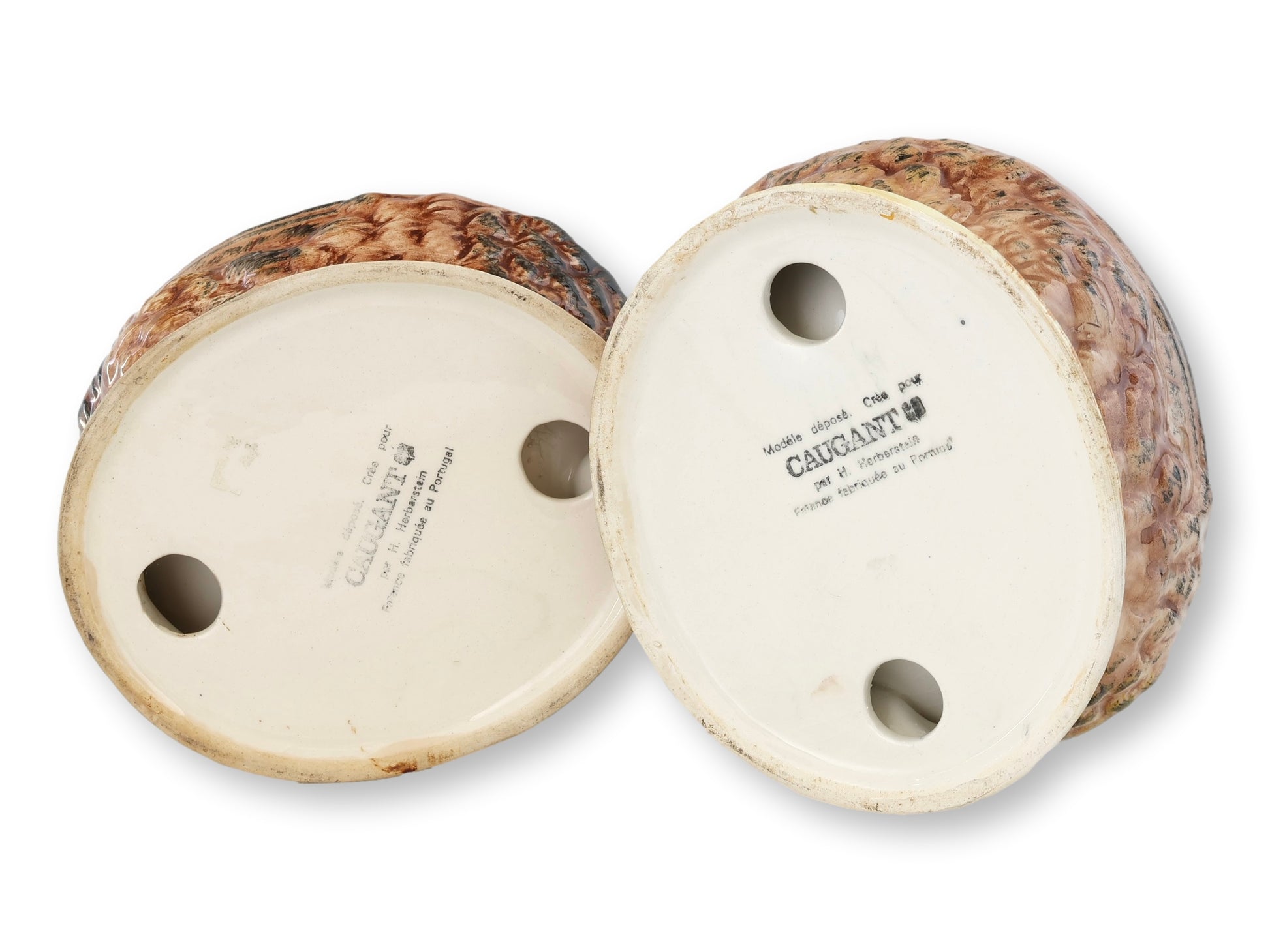 A collectible pair of Michel Caugant French majolica hen tureens, hand-painted in naturalistic tones of brown, cream, and red. Originally designed to serve pâté, these midcentury figural dishes now lend timeless French charm to any table or display. Perfect for hors d’oeuvres, trinkets, or simply clucking up conversation at your next soirée. Each is stamped on the underside and beautifully detailed — a classic blend of rustic character and refined craftsmanship.