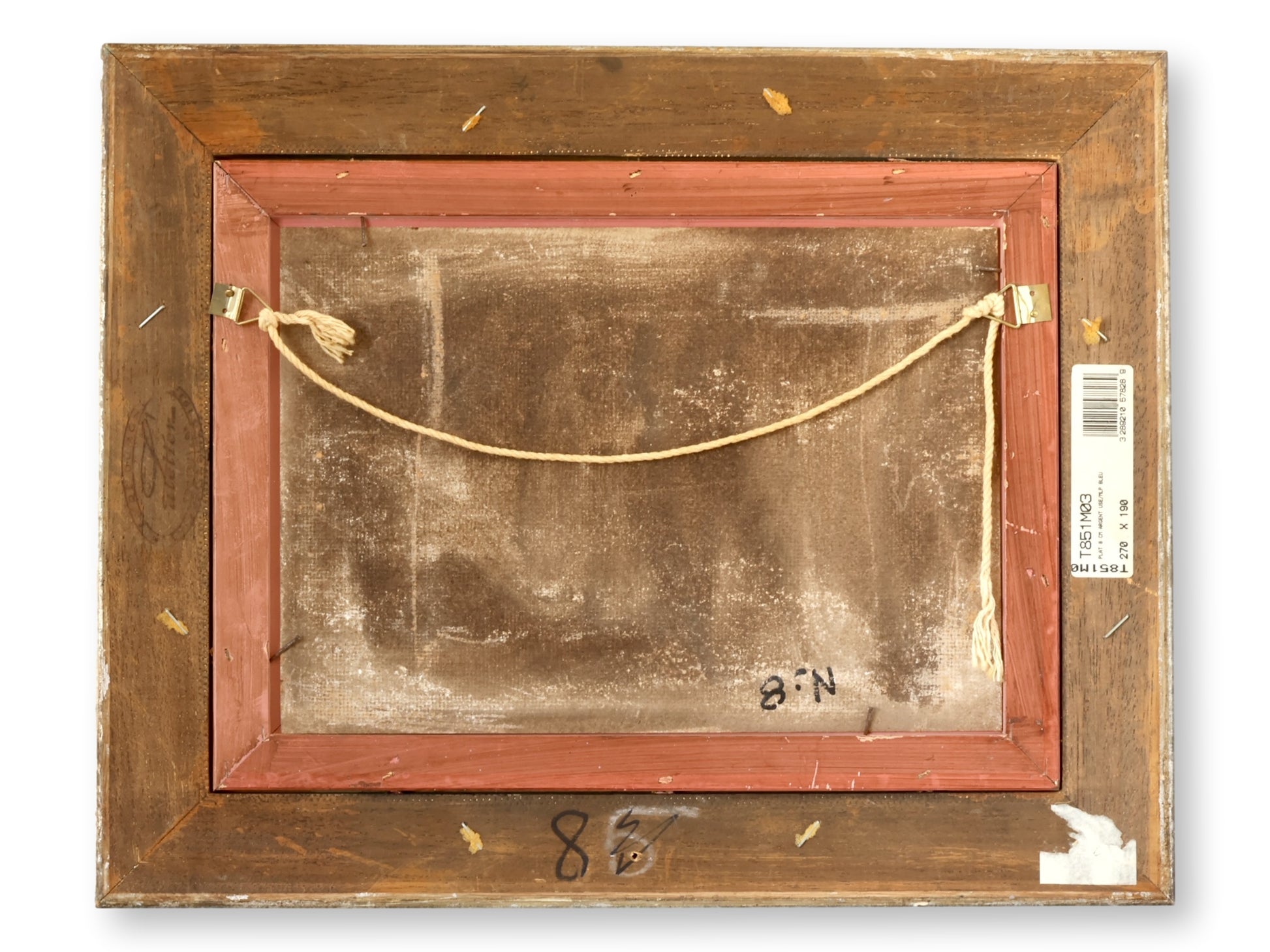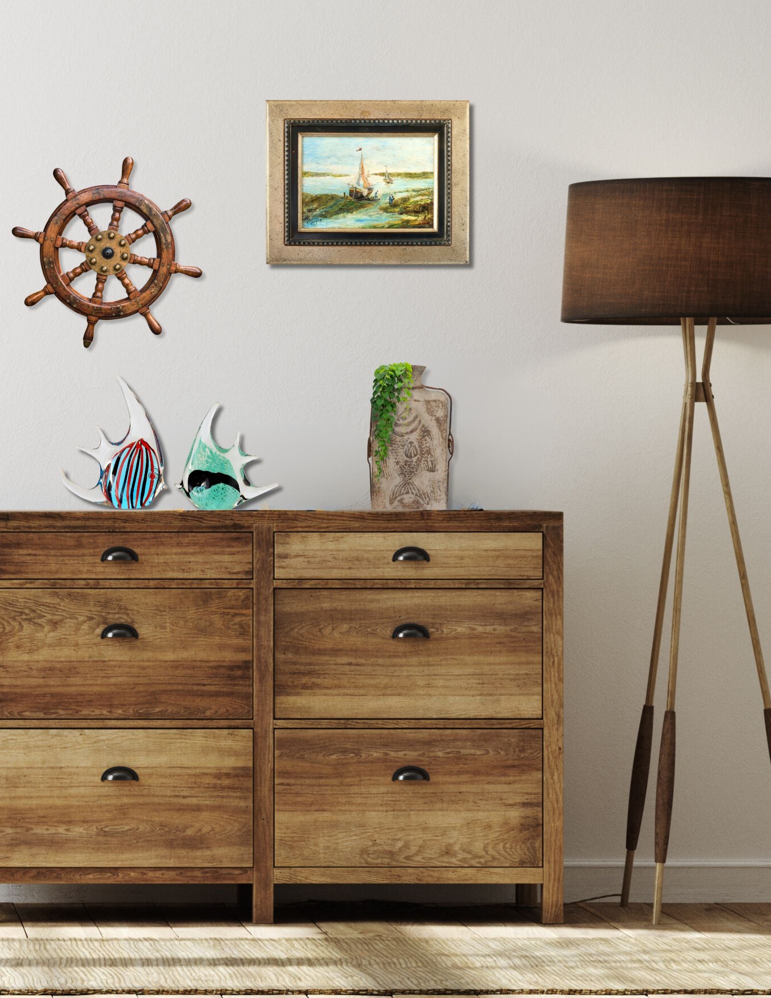 Charming French oil on board depicting oyster gatherers along the Normandy coast, with small fishing boats resting in the shallows beneath a bright maritime sky. Figures in traditional regional dress tend to their work at low tide, while the French tricolor waves proudly from the mast — anchoring the scene in the heart of France’s northern coast. Painted in vivid tones of blue and green, the artist captures the shimmering light and tidal energy distinctive to Normandy’s shores. Presented in a later silver-toned frame with black and gilt accents, this piece beautifully reflects the spirit of coastal life and the craftsmanship of early 20th-century French painting.