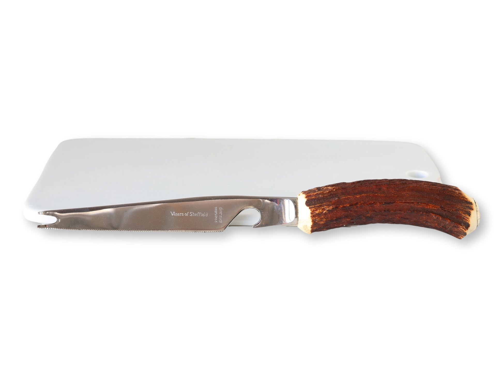 French white porcelain cheese board paired with a classic cheese knife marked "Viners of Sheffield," featuring a natural stag horn handle. The simple rectangular board is elegant and timeless, while the knife brings a rustic edge with its antler grip—perfect for entertaining. A refined mix of materials that balances French minimalism and English craftsmanship. Knife and board sold together.