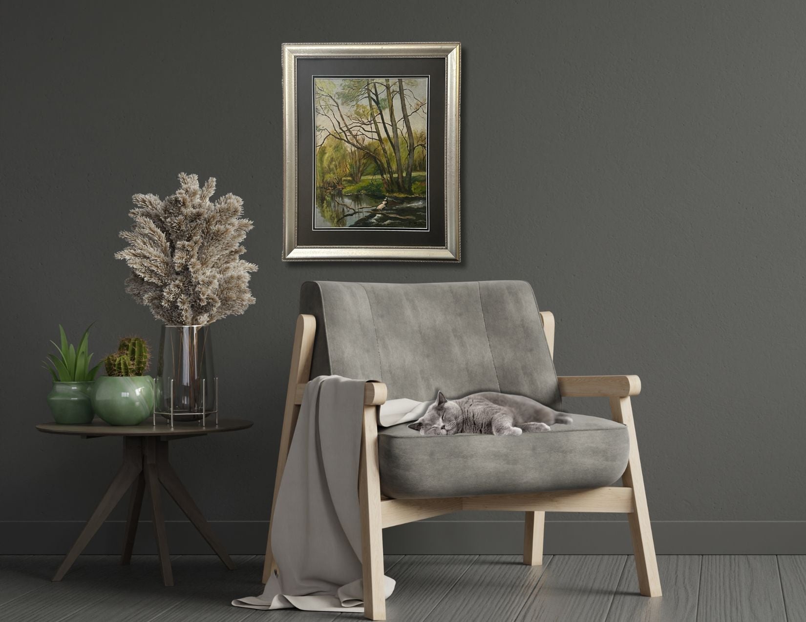 A tranquil French oil on board depicting a serene riverbank where tall trees rise gracefully and lean over the reflective water, their forms mirrored in the gentle current. Painted with a naturalist’s eye, the work captures dappled greens and soft light for a timeless countryside atmosphere. Signed lower right. Newly presented in a silver-toned frame with dark matting, displayed without glass in keeping with traditional oil presentation.