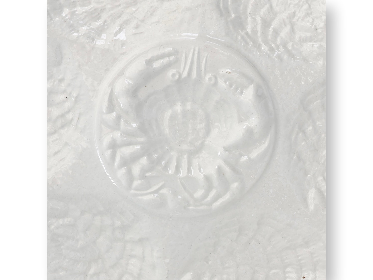 French oyster plate by Sarreguemines, glazed in glossy white faience. The molded design features six wells encircling a raised crab center, with subtle shell relief adding texture and depth. Marked Sarreguemines France on the underside.