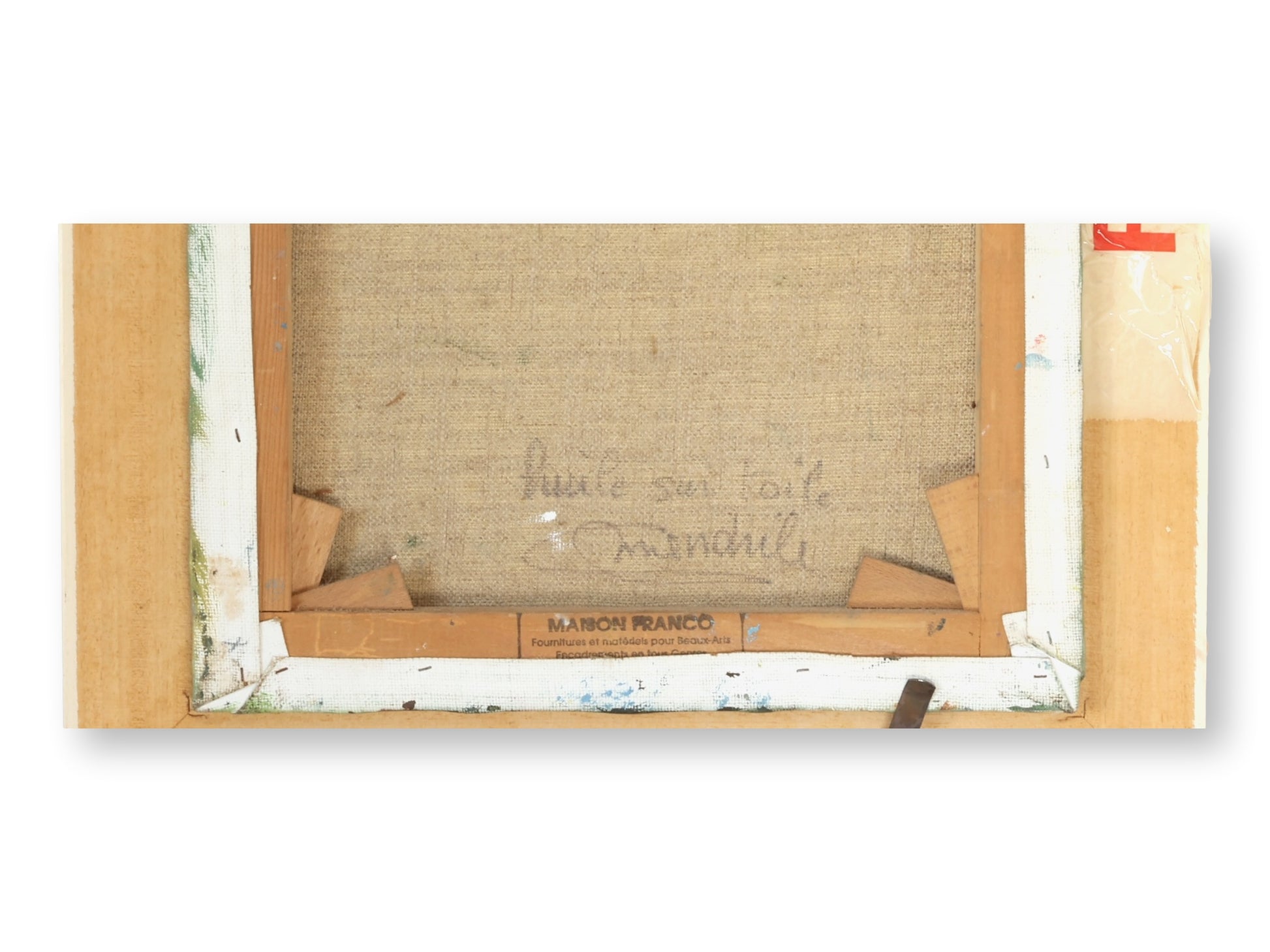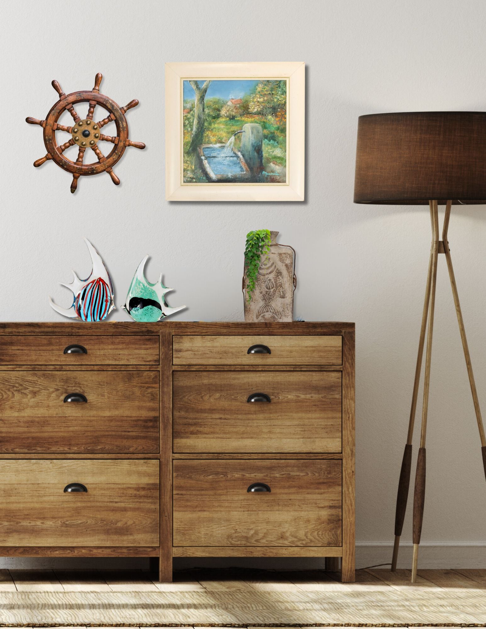 Charming vintage French oil on canvas, artist signed lower right. The composition depicts a rustic village fountain shaded by a tree, with cottages and gardens beyond, rendered in vibrant, impressionistic strokes. Lively color and texture capture the warmth of the French countryside in a decorative, inviting scene. Light wear consistent with age. Original frame as found.