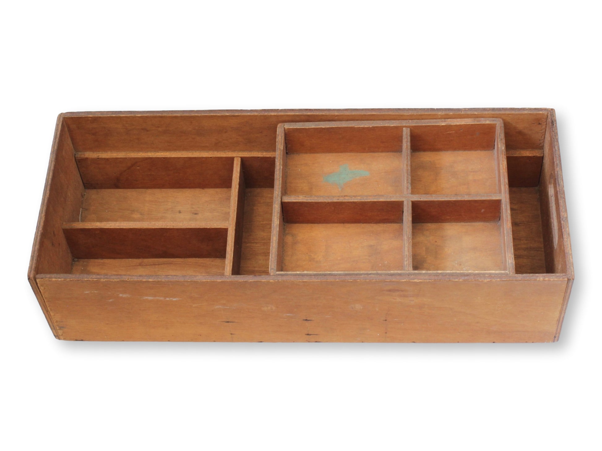 Handmade midcentury wooden storage box with removable interior tray. Thoughtfully divided for organizing tools, hardware, or craft supplies. Cutout handles make it easy to carry from project to project. A functional piece with warm patina and vintage charm—perfect for the workshop, studio, or kitchen.