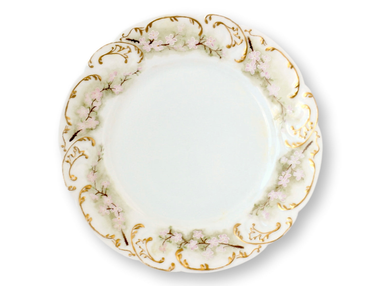 This exquisite set of 10 Haviland Limoges luncheon plates features delicate hand-painted floral motifs in soft pastel colors, highlighted by intricate gilt accents along the scalloped edges. The unique and unusual design showcases the elegance and artistry for which Haviland is renowned. Perfect for special occasions or as a cherished addition to your collection, these plates bring timeless charm and sophistication to any table setting. Marked on back.