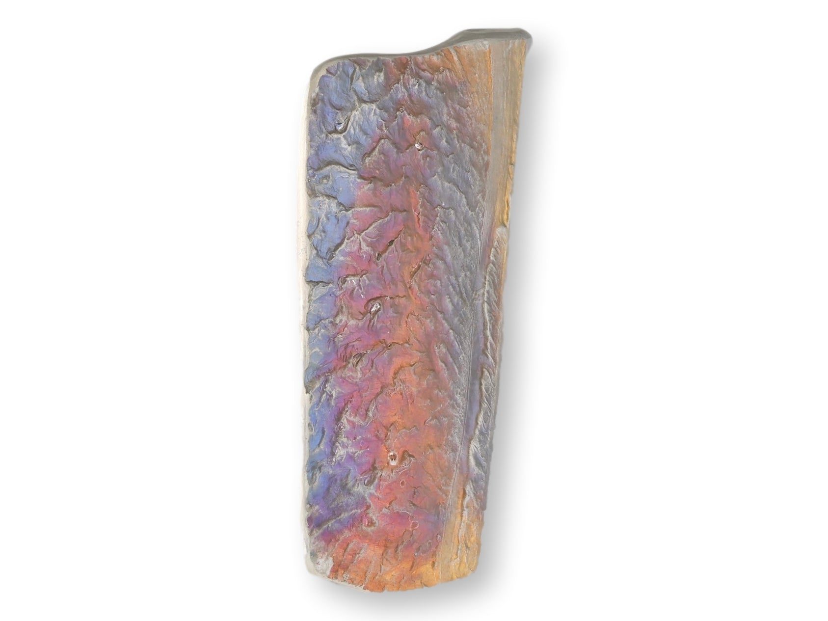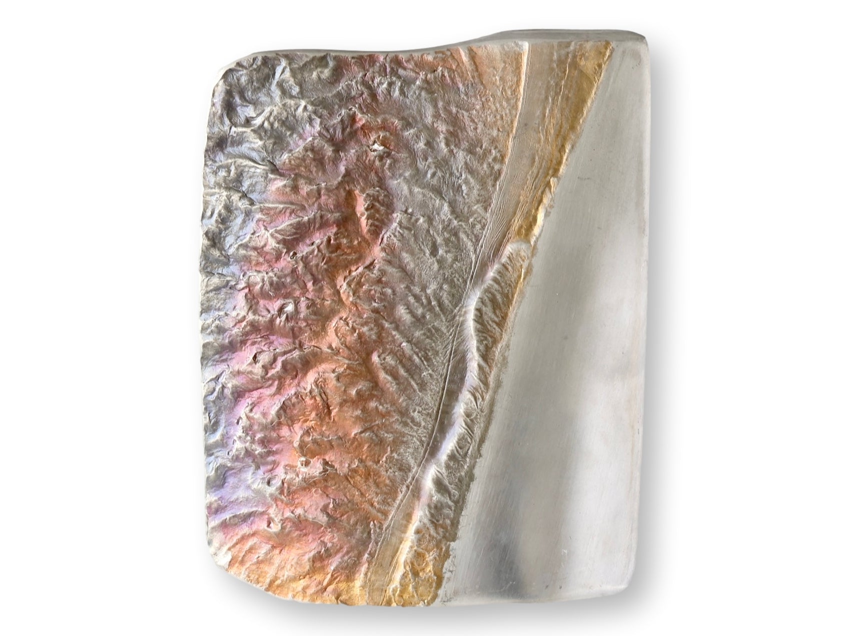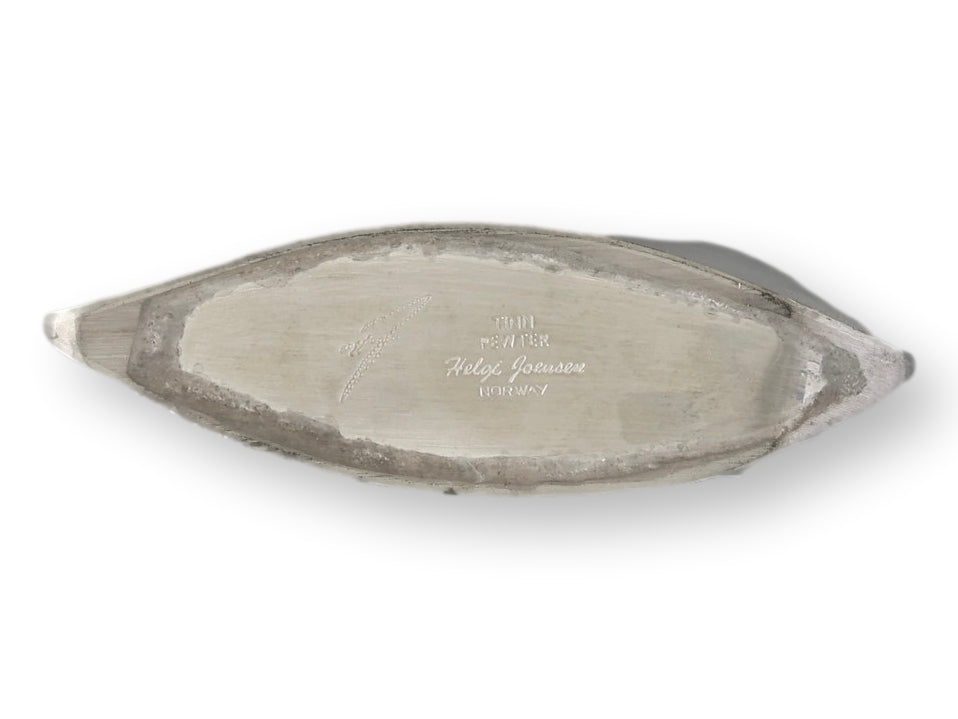 A striking Brutalist / Modernist sculptural vase by Norwegian artist Helgi Joensen, signed to the base. Crafted in polished pewter with a hand-worked, deeply textured surface, the design highlights dramatic relief and iridescent coloration, balanced against smooth, minimalist planes. Circa 1970s, this powerful piece embodies the raw yet refined spirit of Scandinavian modernism and stands as both vessel and sculpture. Impressed marks and artist signed.