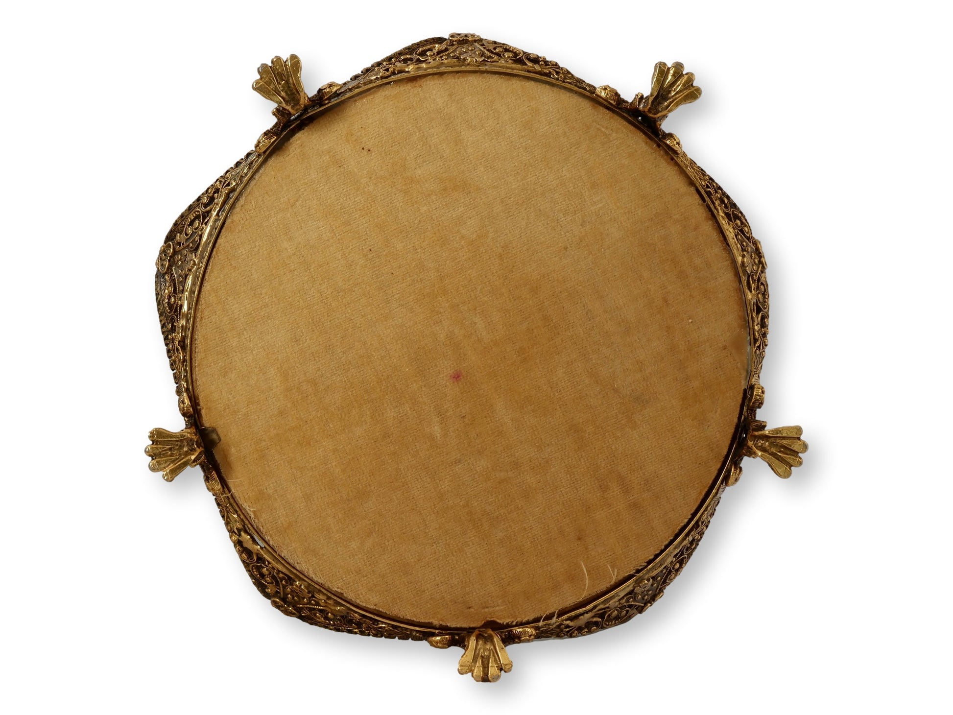A glamorous Hollywood Regency jewelry box framed in gilt ormolu with faceted beveled glass panels and delicate filigree detailing. Raised on petite paw feet, this piece reflects the golden age of cocktail-hour elegance, when vanity accessories doubled as decorative statements.