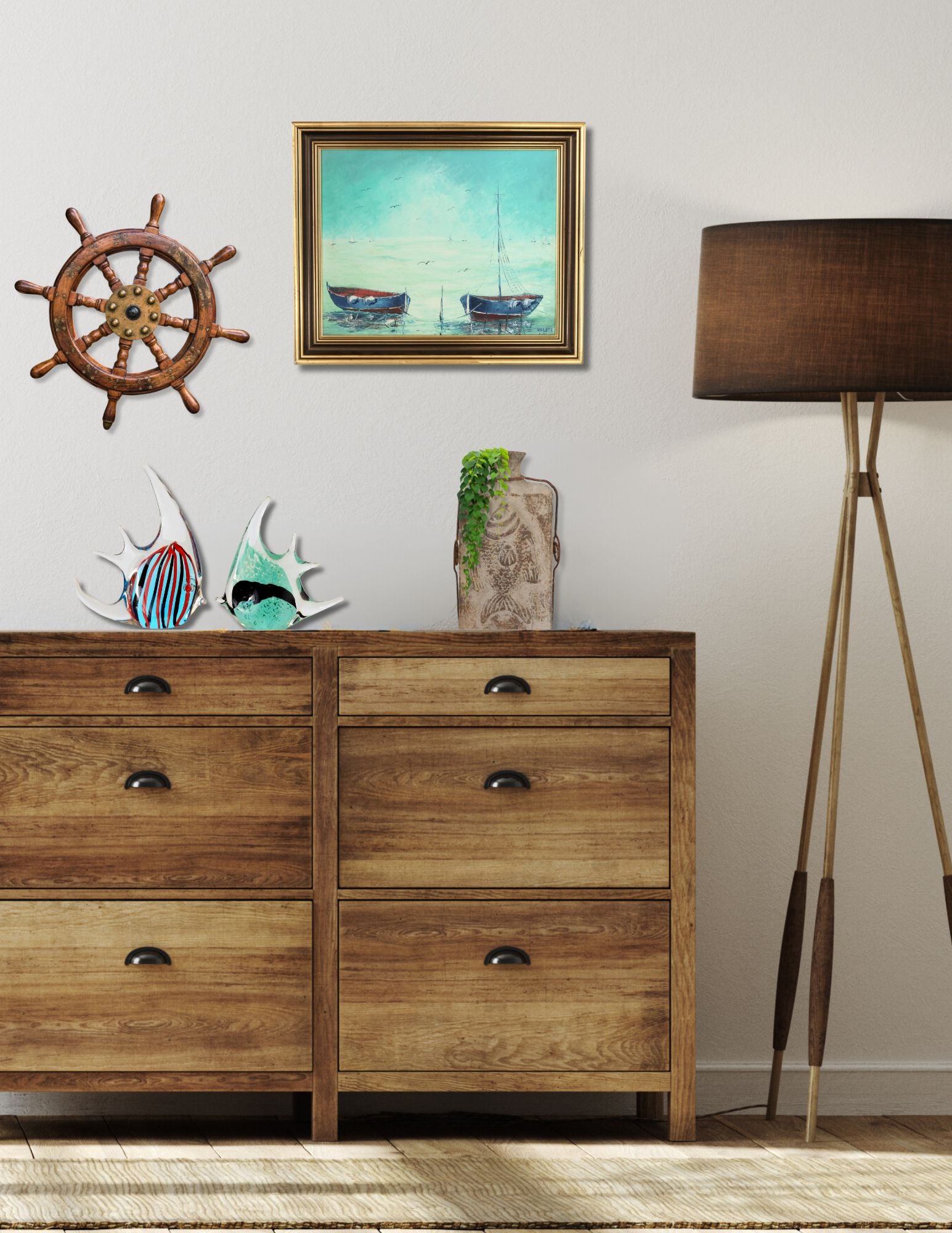 Signed Valota, this mid-20th century coastal painting captures the timeless rhythm of life along the Italian Riviera. Two working fishing boats rest in the shallows, their red hulls and draped nets a nod to their daily purpose, while seabirds circle overhead and distant sails scatter across a turquoise horizon. The artist's bold palette and textured brushwork bring atmosphere and vitality to the scene.