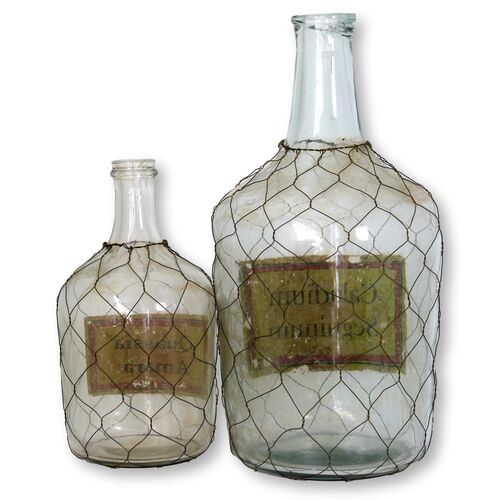 These hand-blown glass bottles are a testament to the fusion of functional design and artistic craftsmanship. Encased delicately in a web of wire, they exude a vintage aura, reminiscent of a time when meticulous attention was bestowed upon even the most everyday objects. The pharmacy labels, though faded with the passage of time, hold whispers of their former purpose, making them an evocative piece for collectors or lovers of antique curiosities. When illuminated, as depicted in the accompanying photo, the labels come to life, glowing softly, their inscriptions inviting you to journey back to another era. The beauty of the glass, the mystique of the labels, and the intricate wirework make these bottles a truly unique find.