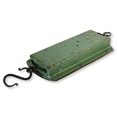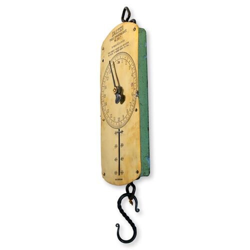 Unusually large Salter branded hanging scale. Weighs volume up to 60 lbs with spring loaded hook. Beautifully polished brass face and clearly readable engraved numbers and lettering.