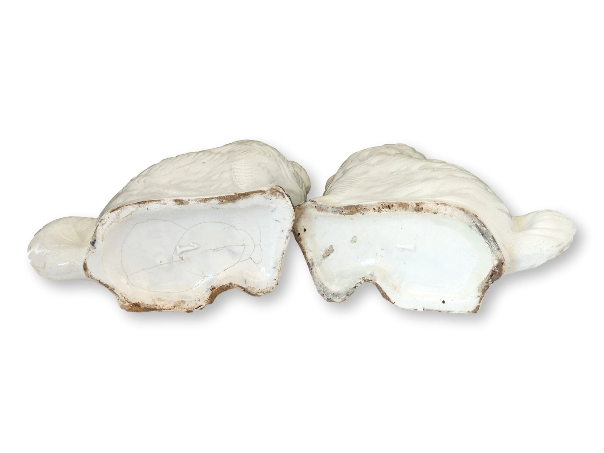 A superb pair of large Staffordshire spaniels, circa 1860, each with raised number "1" on the underside, signifying the largest and most desirable size in the model range (with 6 being the smallest). Numbered examples are especially sought after by collectors. Finely modeled with detailed fur, gilt chain and locket, and expressive faces. Typical firing lines and glaze flaws from manufacture are present, adding authenticity without detracting from their charm. Rare to find in matched pairs.