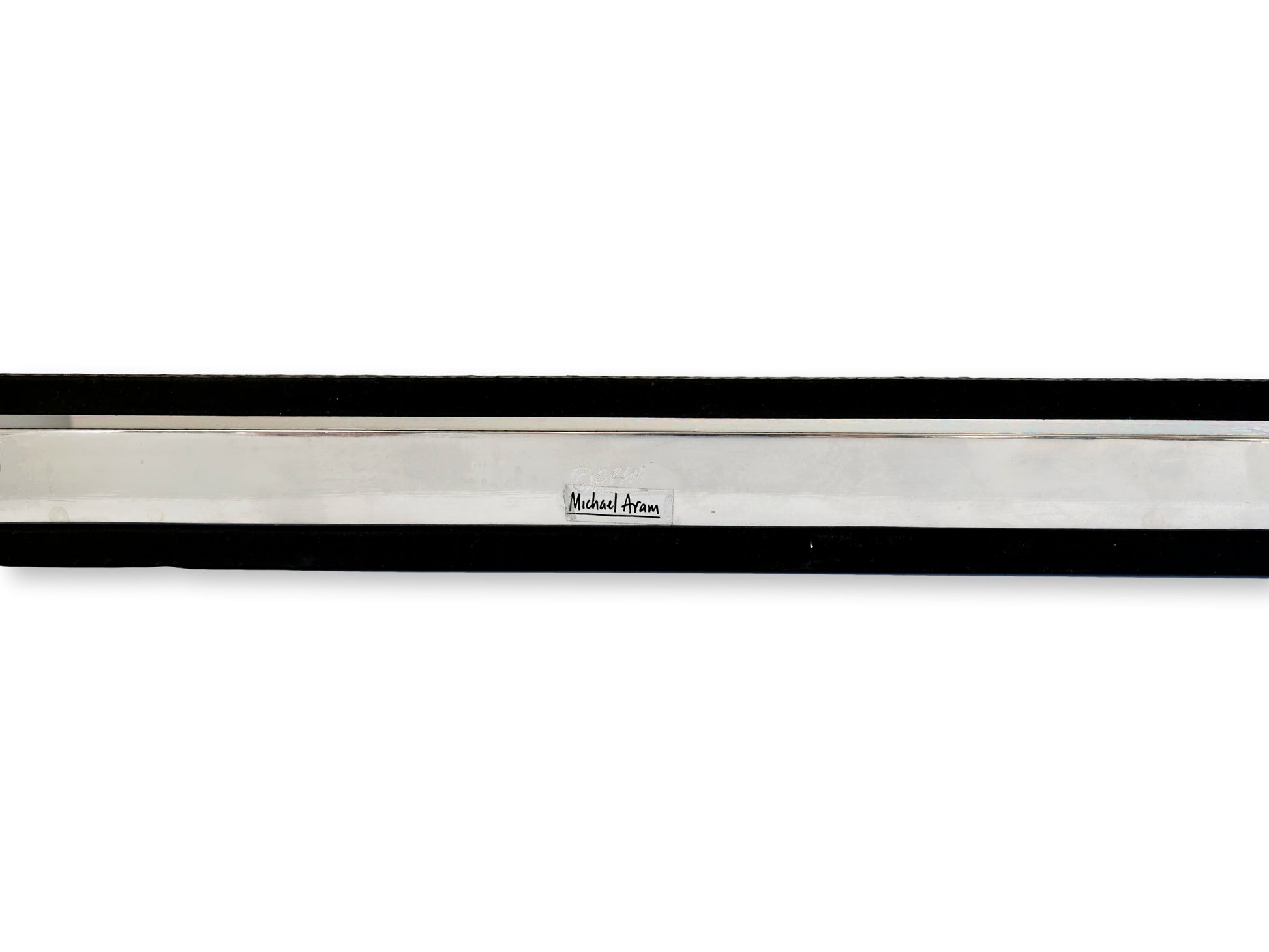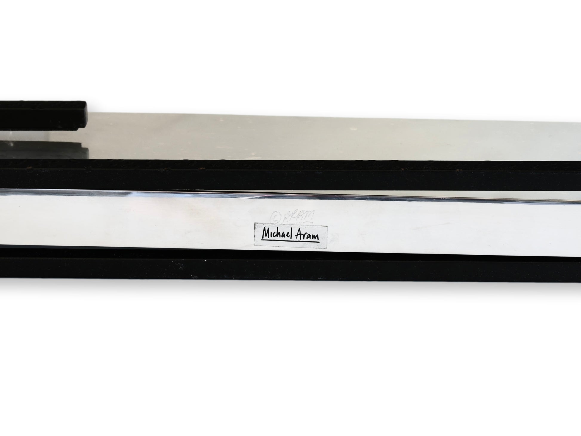 Sleek, sculptural, and unmistakably Michael Aram. This 35.5" long chrome and iron planter brings industrial elegance to contemporary interiors. Signed by the artist, it pairs mirror-polished metal with a black iron frame in a modernist geometric form—perfect for succulents, orchids, or minimalist arrangements. A functional statement piece that channels gallery energy straight to your tabletop.