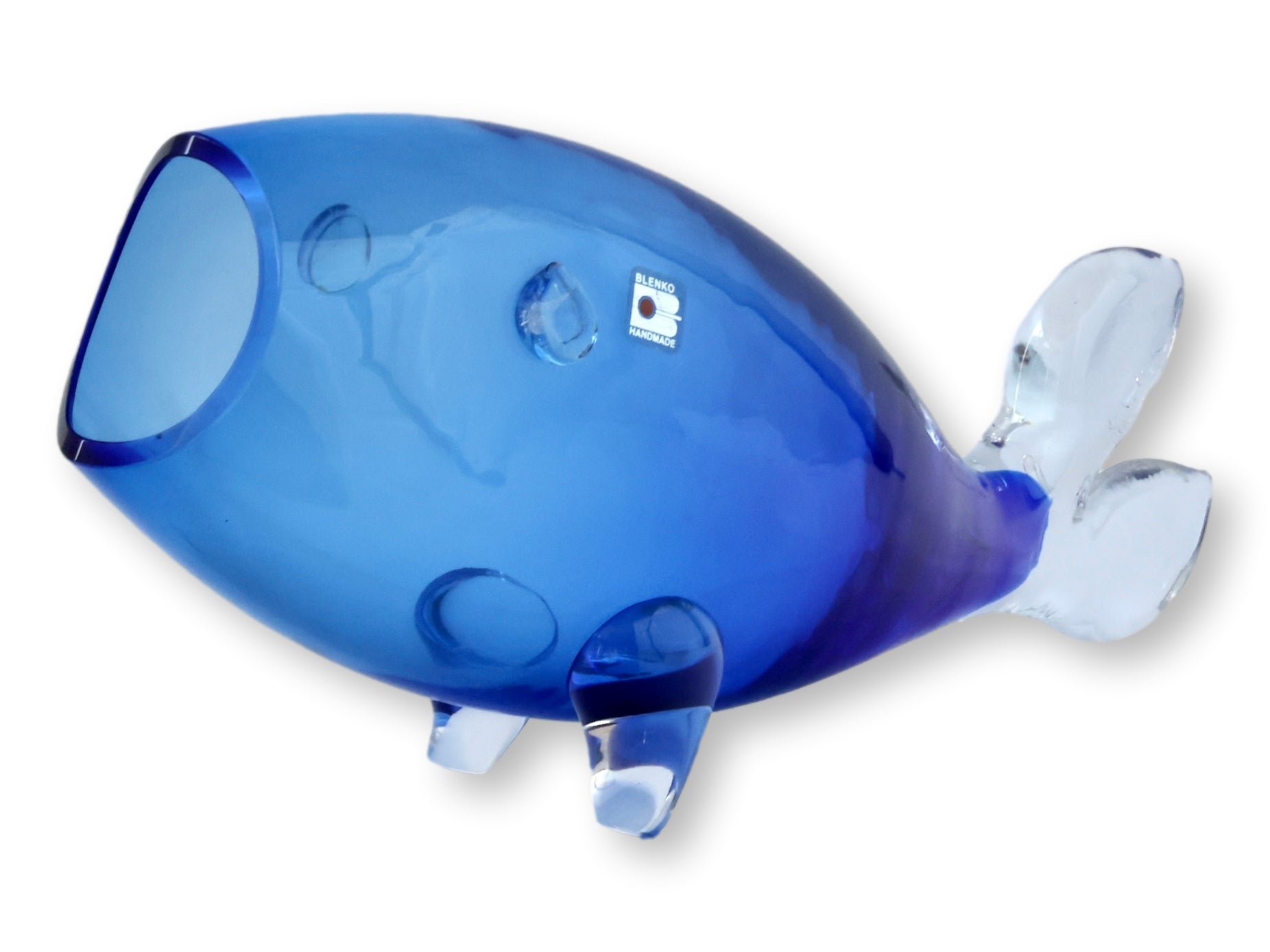 A whimsical and sculptural Blenko art glass fish, hand-blown in West Virginia and retaining its original foil label. Rendered in vibrant ocean blue with clear fins and tail, this midcentury icon embodies the playful artistry that defined Blenko’s golden era. Striking on a bookshelf or console, it’s a statement of American modernism with coastal charm.