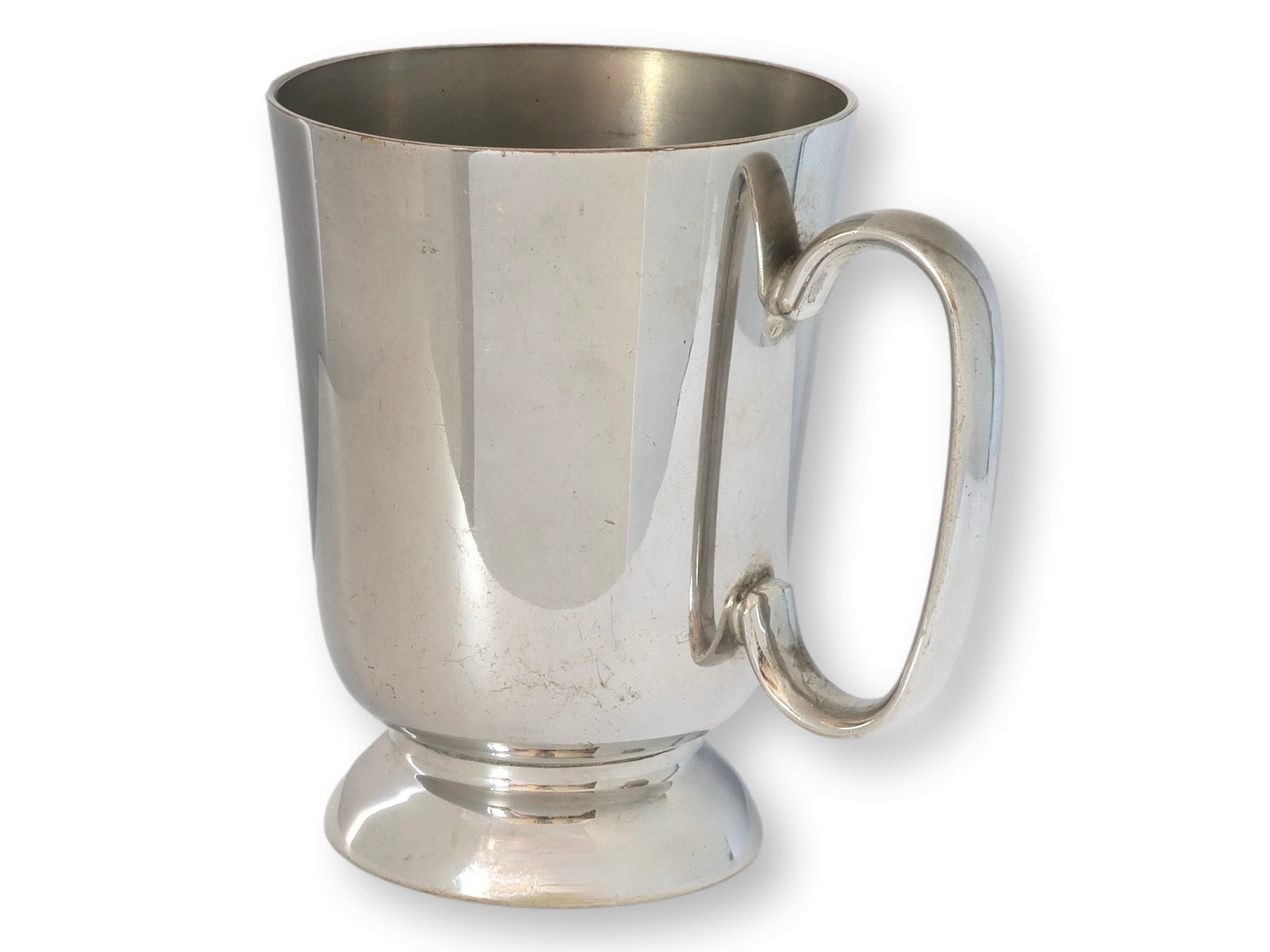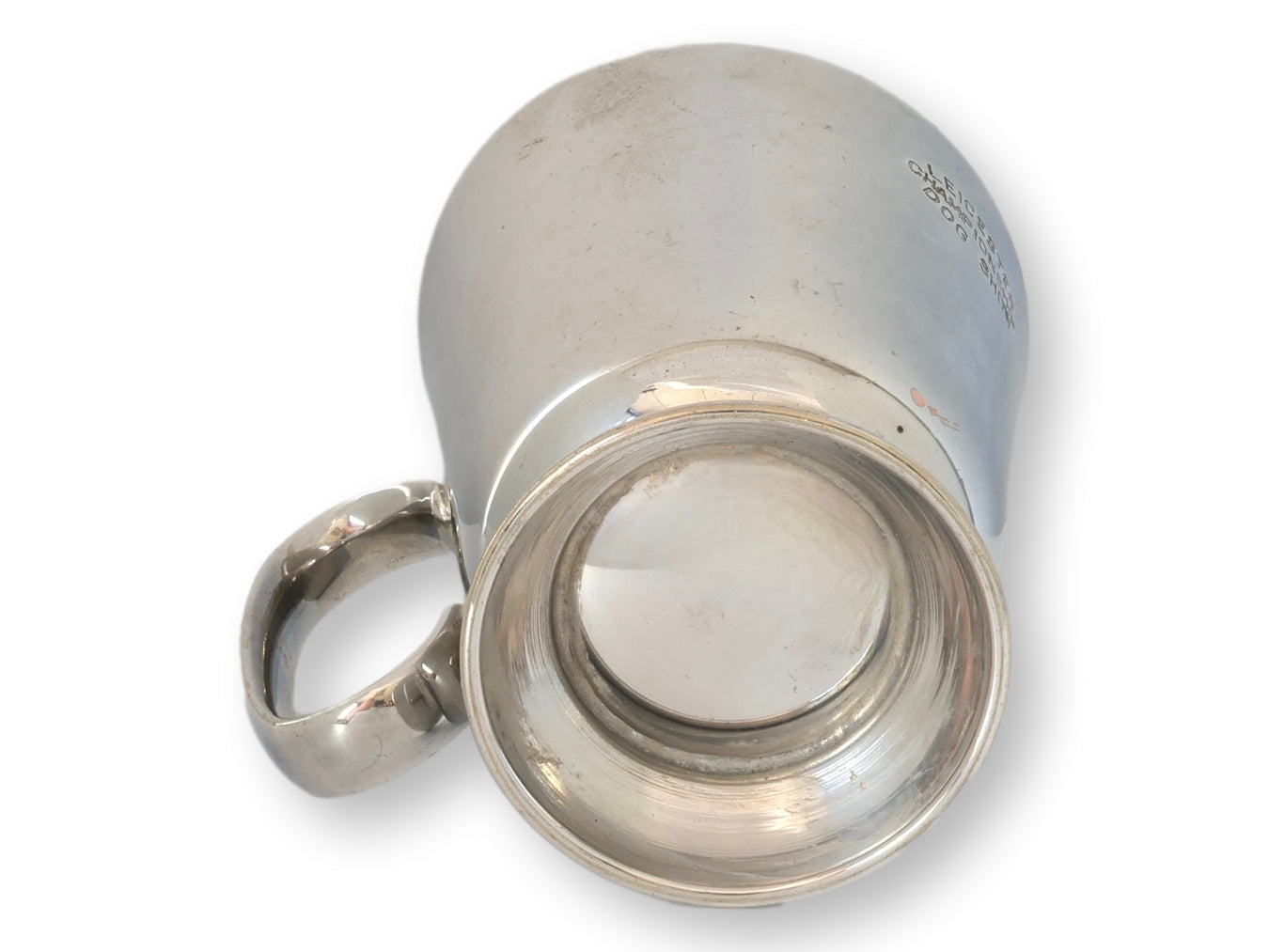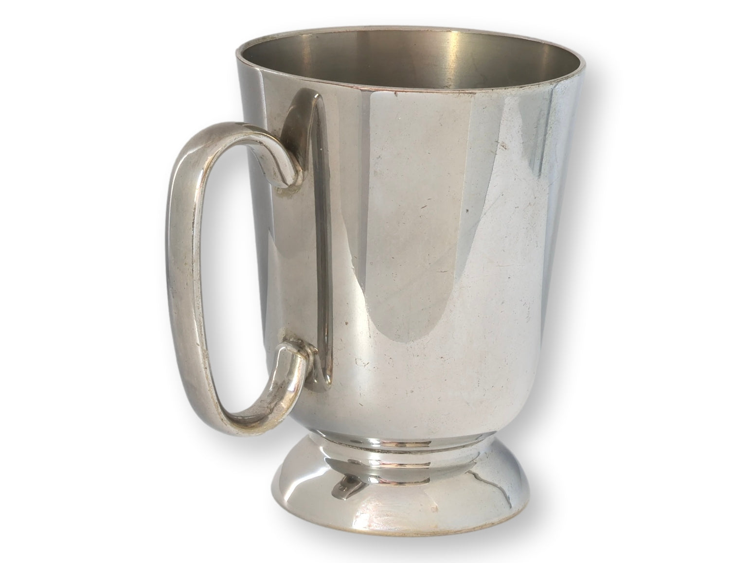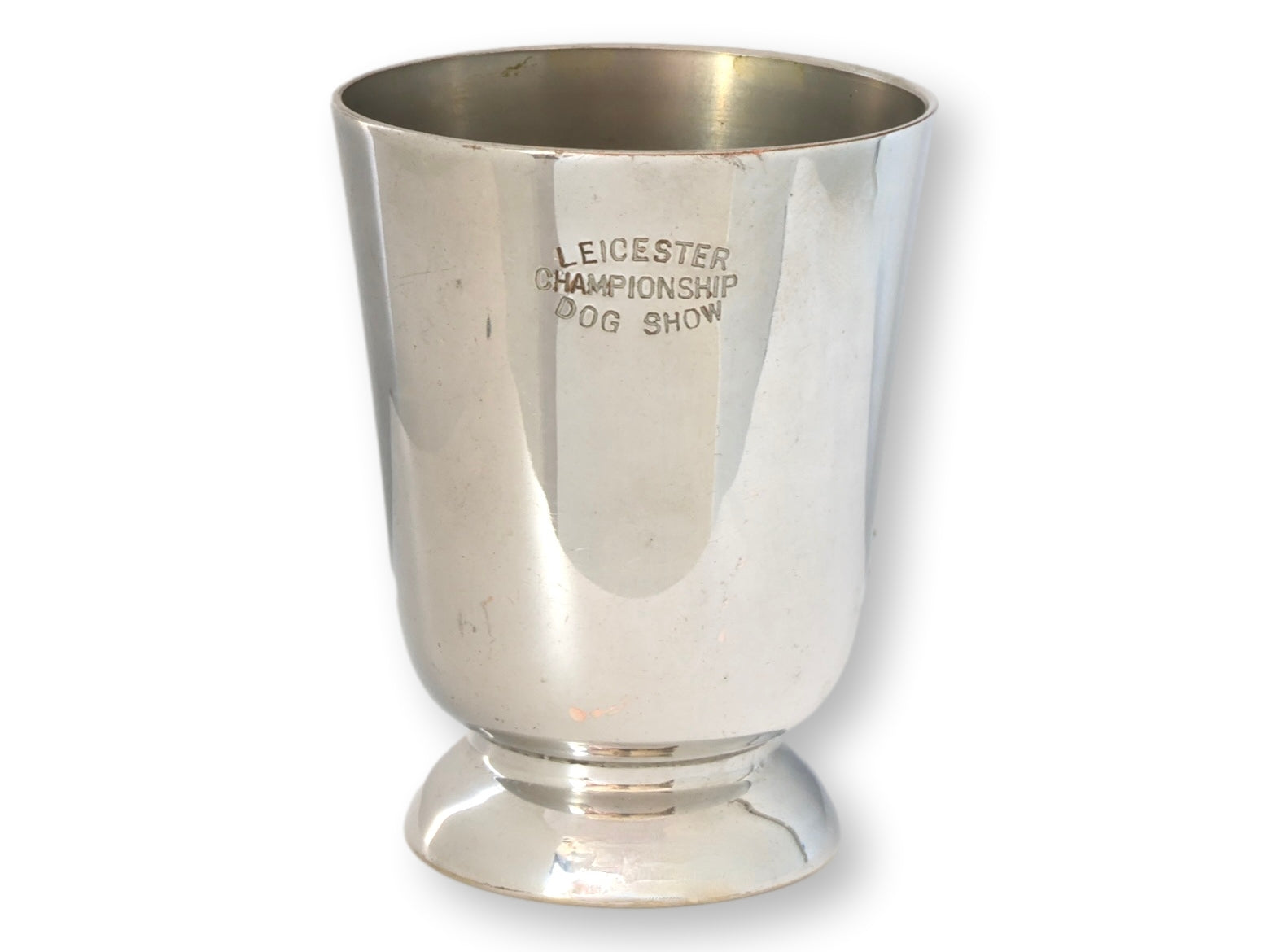 Midcentury English silverplate trophy mug from the Leicester Championship Dog Show. Engraved with the event name, this prize piece captures the tradition of British canine competitions and the pride of award-winning handlers. A wonderful collectible for dog enthusiasts, breeders, and kennel club historians, it celebrates the enduring heritage of championship shows while offering a stylish display piece.
