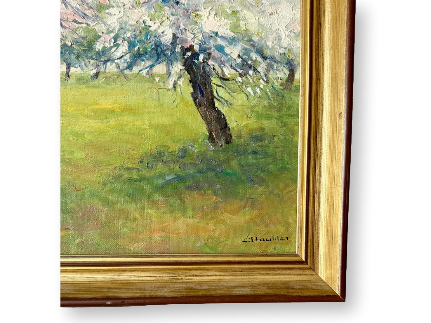 French oil on canvas depicting a beautiful meadow with flowering trees. Radiating with soft spring colors, it embodies the artistic essence of its era. Framed as we found it in a wood frame. Each brushstroke whispers tales of French culture and creativity, offering a window into the eclectic world of midcentury artistry. Signed lower right corner.