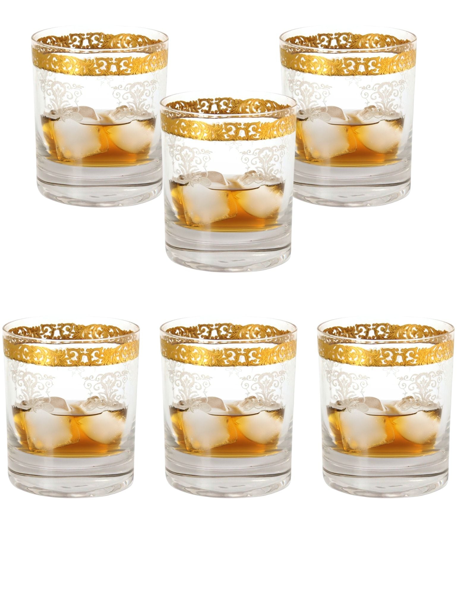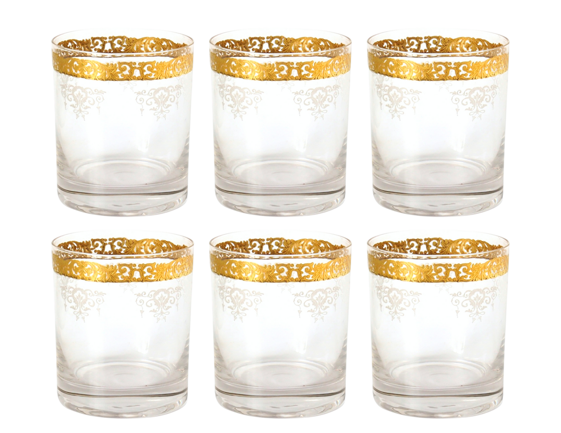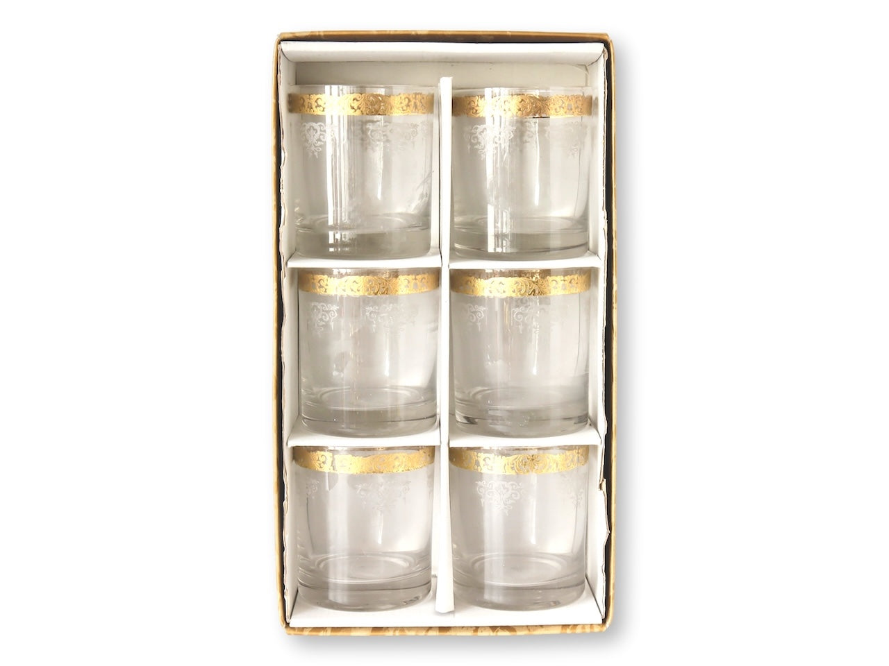 This elegant set of midcentury French lowball glasses features exquisite gilded detailing, adding a touch of sophistication to your barware collection. Perfect for serving whiskey, cocktails, or any preferred beverage, these glasses are both functional and stylish. Still housed in their original box, this set is a remarkable find for collectors or anyone seeking timeless, French glassware.