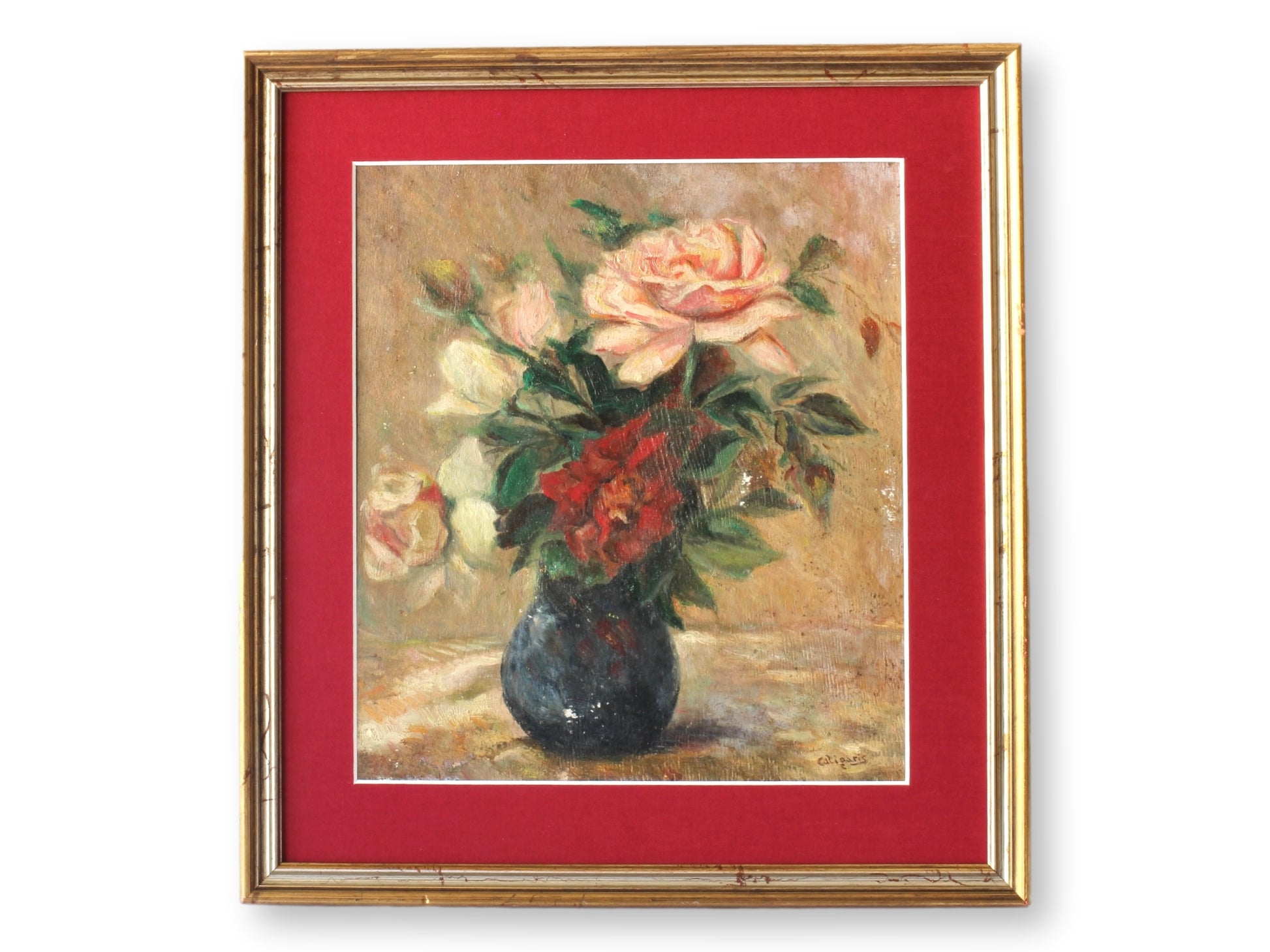 A beautifully composed vintage French still life featuring a vibrant bouquet of roses in a dark vase. The rich red and pink hues of the flowers contrast elegantly with the muted background. Framed with a striking red mat and gilded frame, this piece adds warmth and sophistication to any space. Signed by the artist. Perfect for lovers of French floral art.
