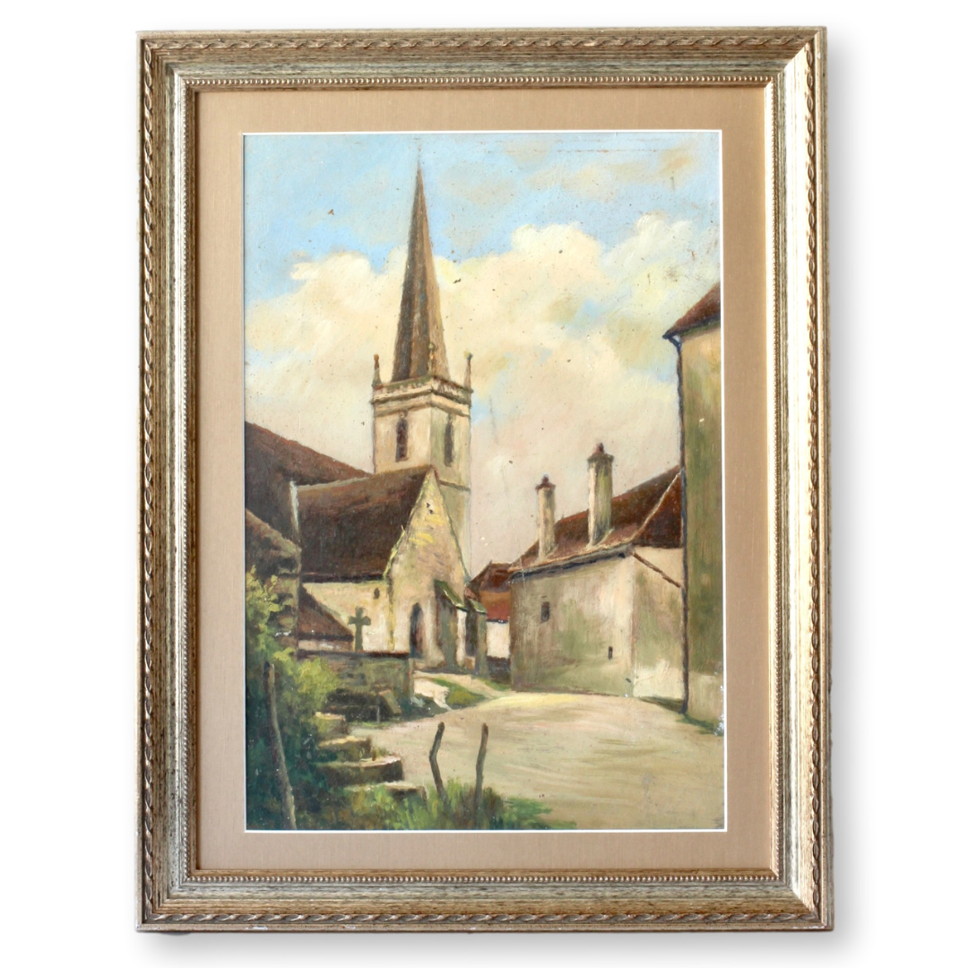 Charming midcentury painting of a quiet French village, featuring a classic church steeple under a bright sky. The artwork is framed in an elegant vintage frame with custom matting, highlighting its serene and timeless appeal. A perfect piece for lovers of French country landscapes or midcentury decor.