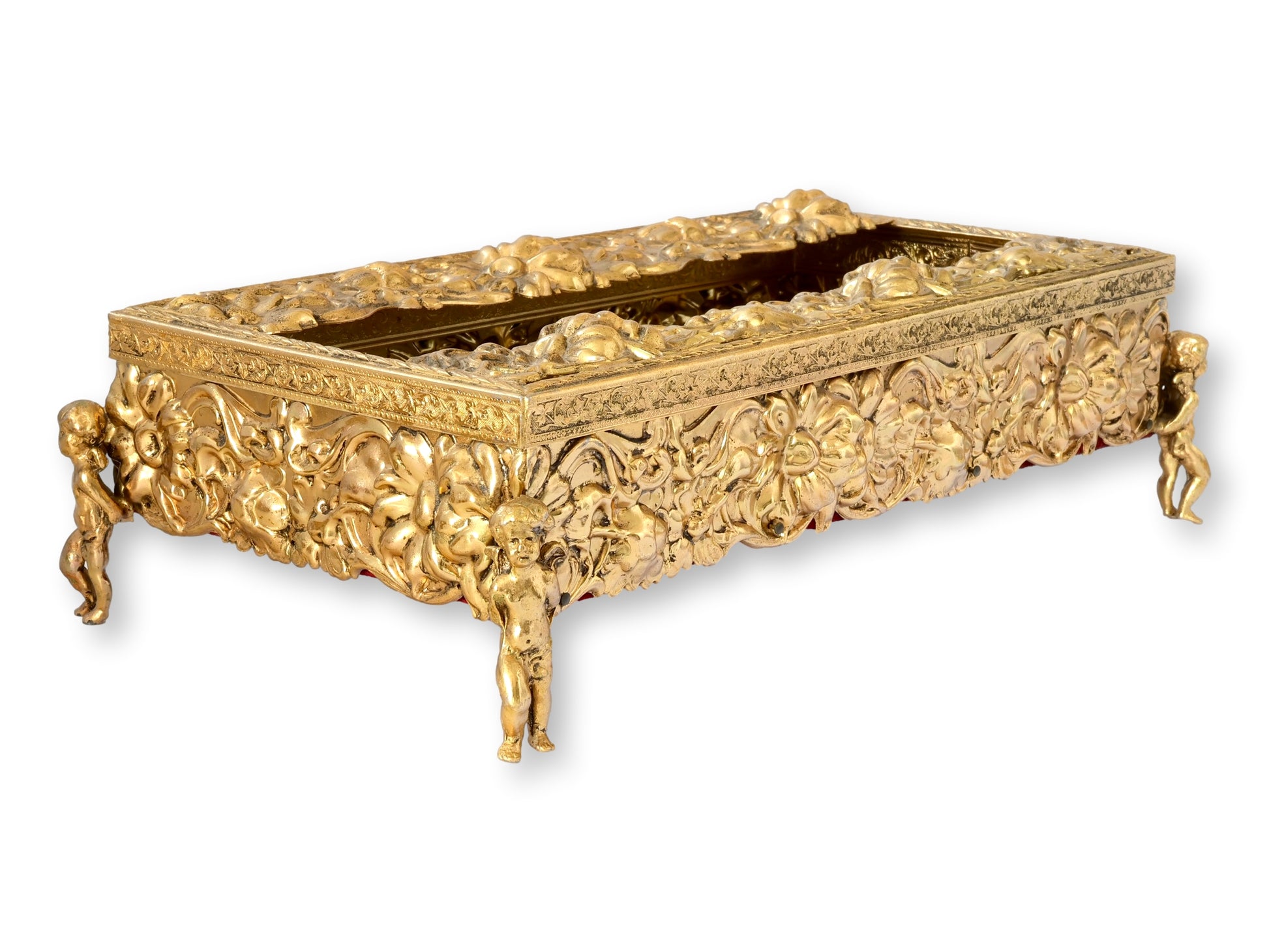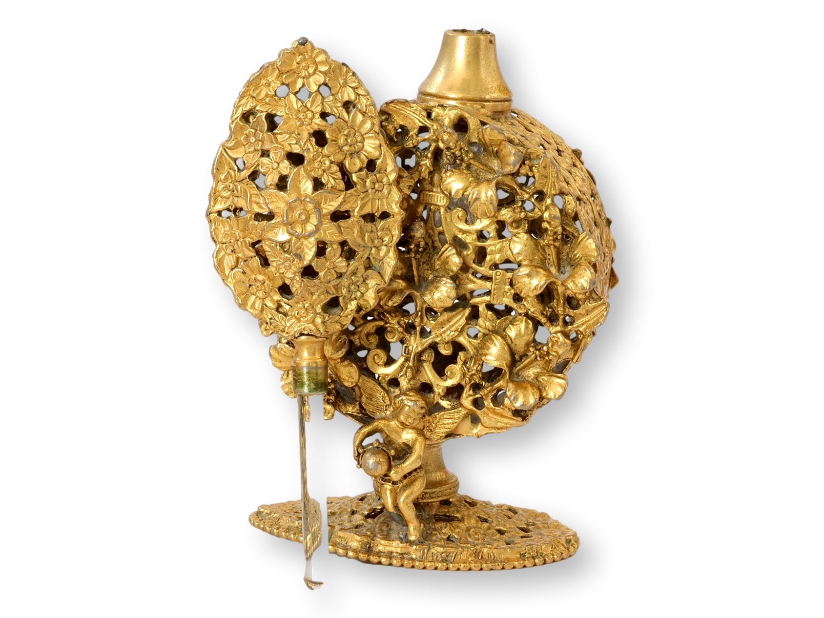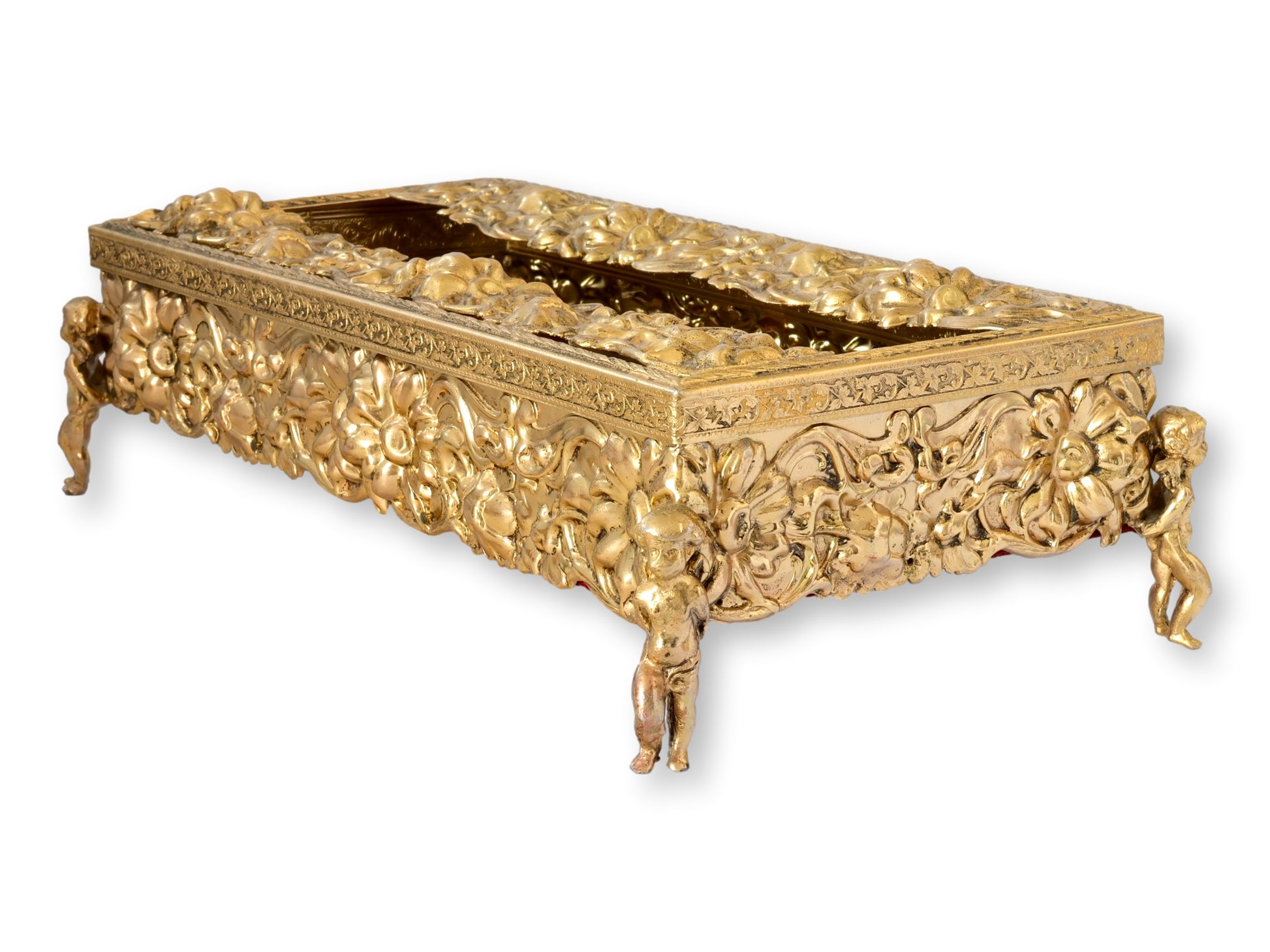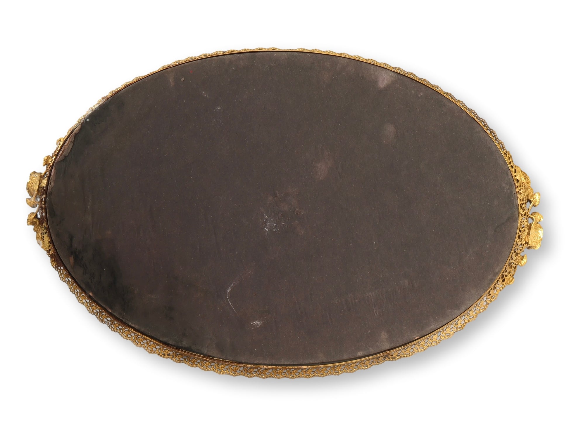 Exquisite midcentury gilt metal vanity ensemble featuring a beveled oval mirror framed with floral garlands and cherub accents, paired with a matching lidded tissue box, ornate lipstick holder, and perfume bottle with filigree overlay. Each piece displays rich gilded detail in the Rococo Revival style, blending opulent ornamentation with graceful form. A beautifully coordinated set ideal for display on a dressing table or as a romantic accent in a guest room or boutique interior.