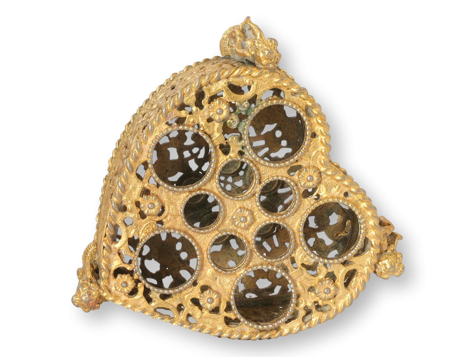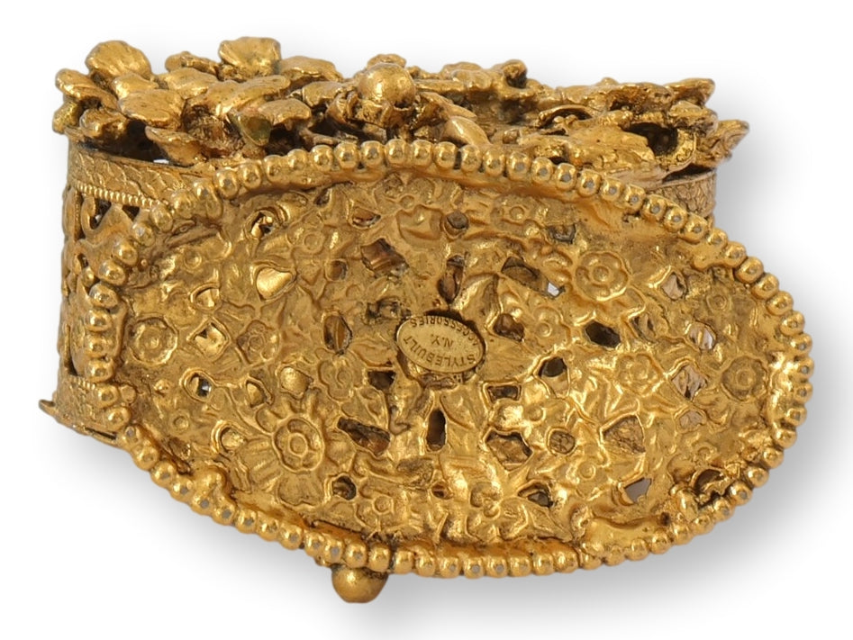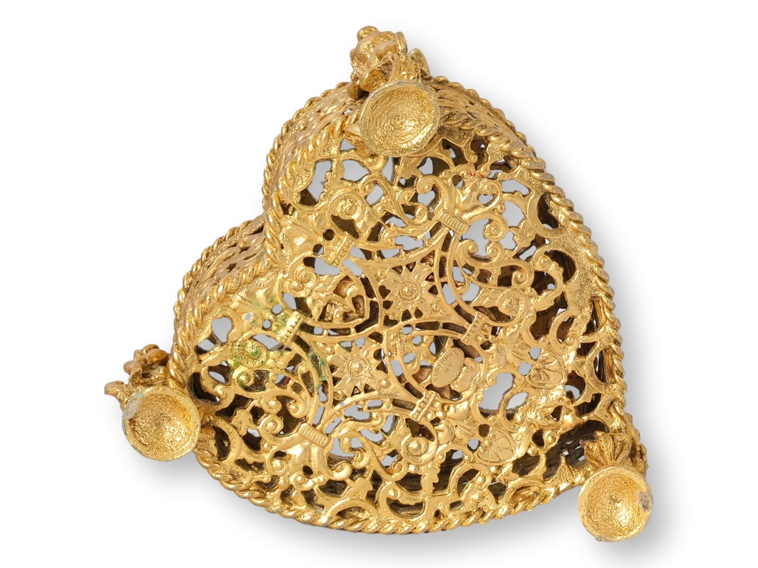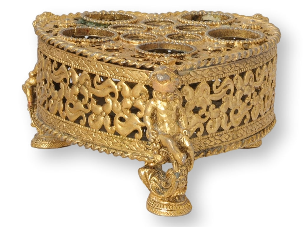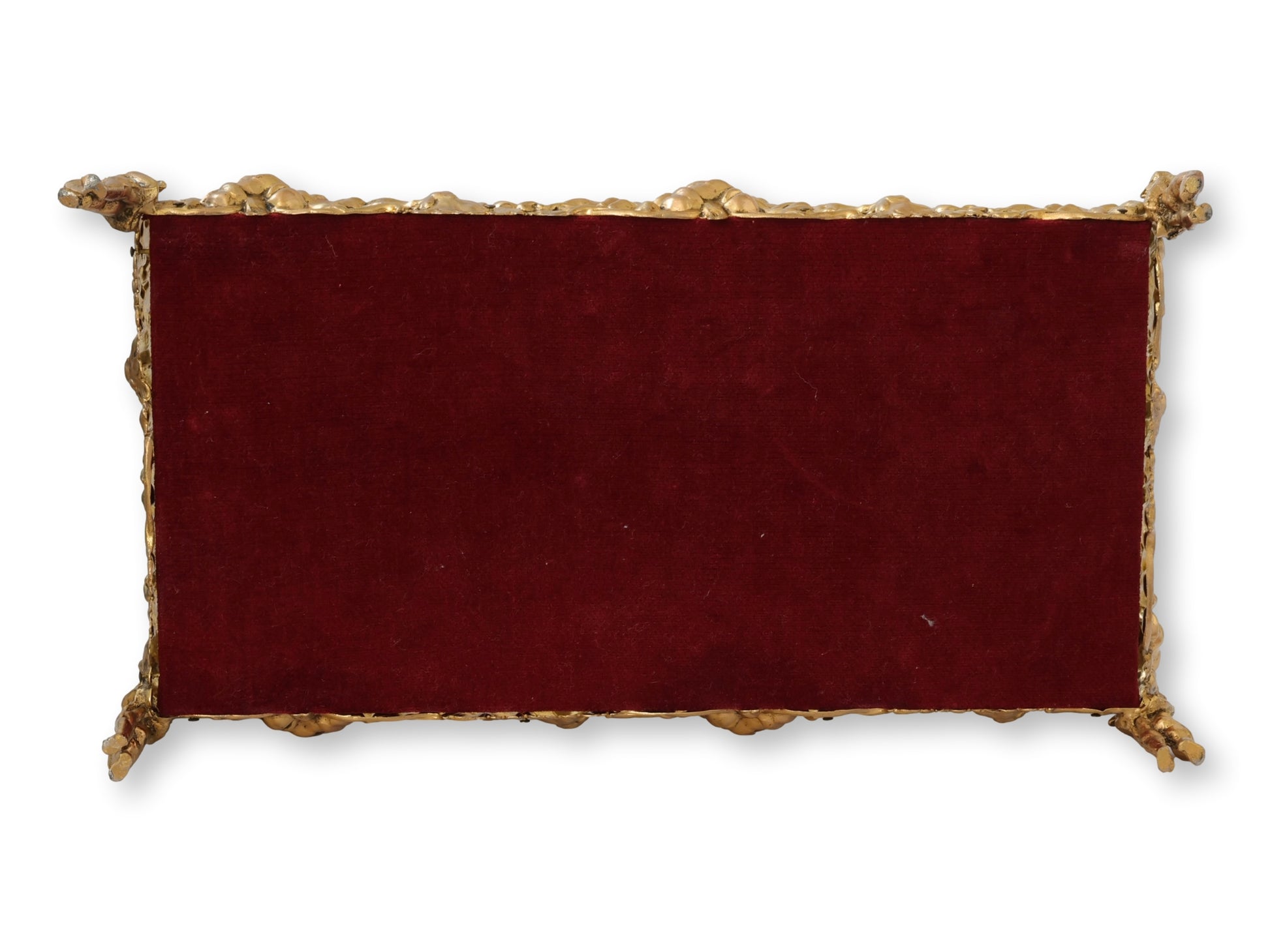 Exquisite midcentury gilt metal vanity ensemble featuring a beveled oval mirror framed with floral garlands and cherub accents, paired with a matching lidded tissue box, ornate lipstick holder, and perfume bottle with filigree overlay. Each piece displays rich gilded detail in the Rococo Revival style, blending opulent ornamentation with graceful form. A beautifully coordinated set ideal for display on a dressing table or as a romantic accent in a guest room or boutique interior.