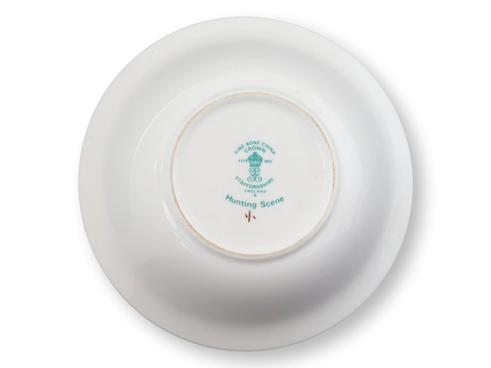 This delightful piece is a Crown Staffordshire fine bone china bowl, featuring a vibrant fox hunting scene that encircles the exterior. The playful depiction of the traditional English hunt, with its vivid colors and dynamic figures, adds a touch of liveliness to the classic white background. Perfect for collectors or as a whimsical touch to your country-themed decor. Maker's mark on bottom.