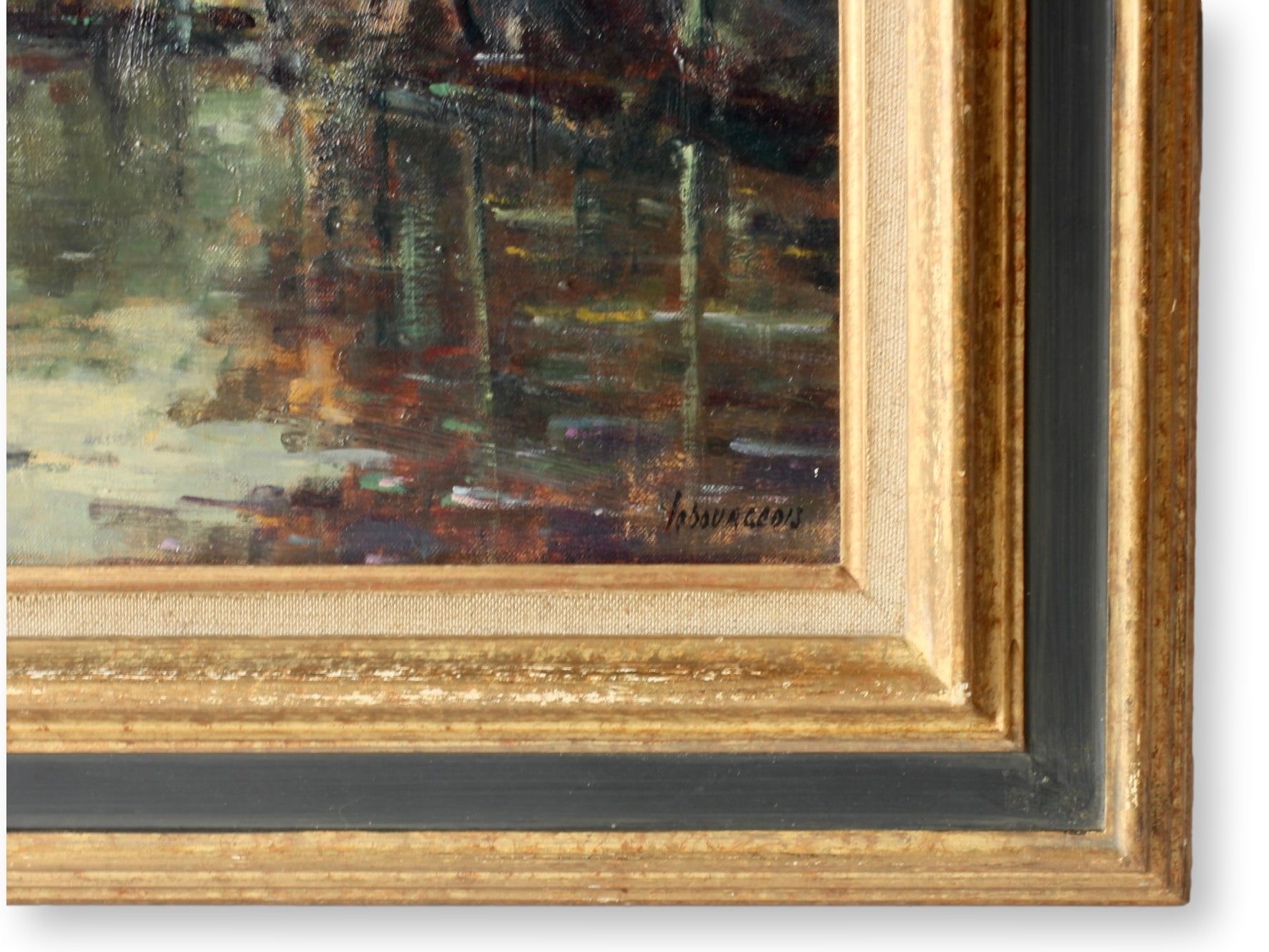 This captivating painting by known French artist, Jacques Lebourgeois, depicts an enchanting autumn river scene, with vibrant reflections of trees in rich orange, yellow, and green hues on the water. The soft impressionistic style and warm color palette create a serene atmosphere. The back of the painting is inscribed with the title, "L’Étang de Gorges les Fane." Framed in a classic giltwood frame, this artwork is a stunning addition to any collection. Signed.