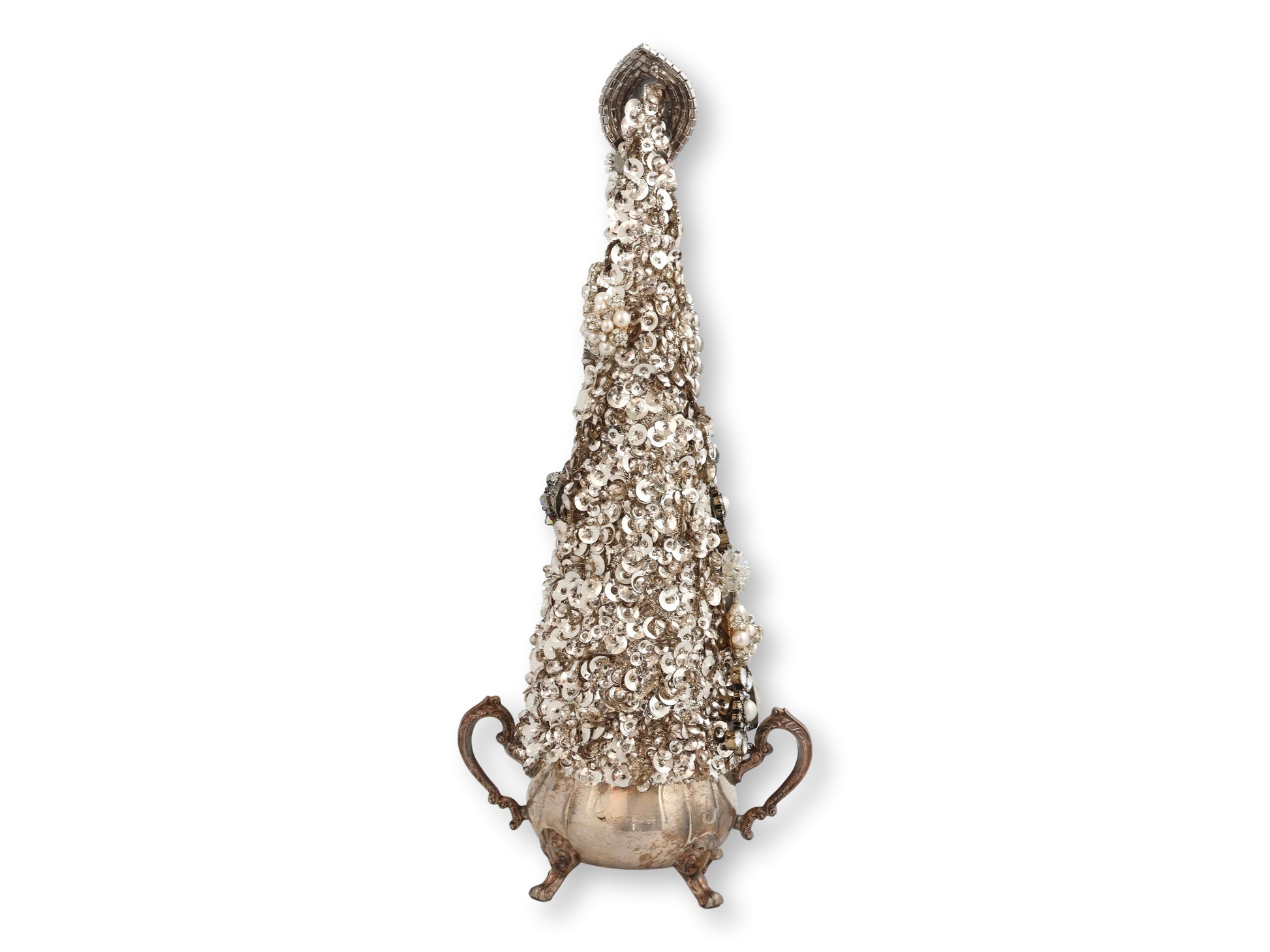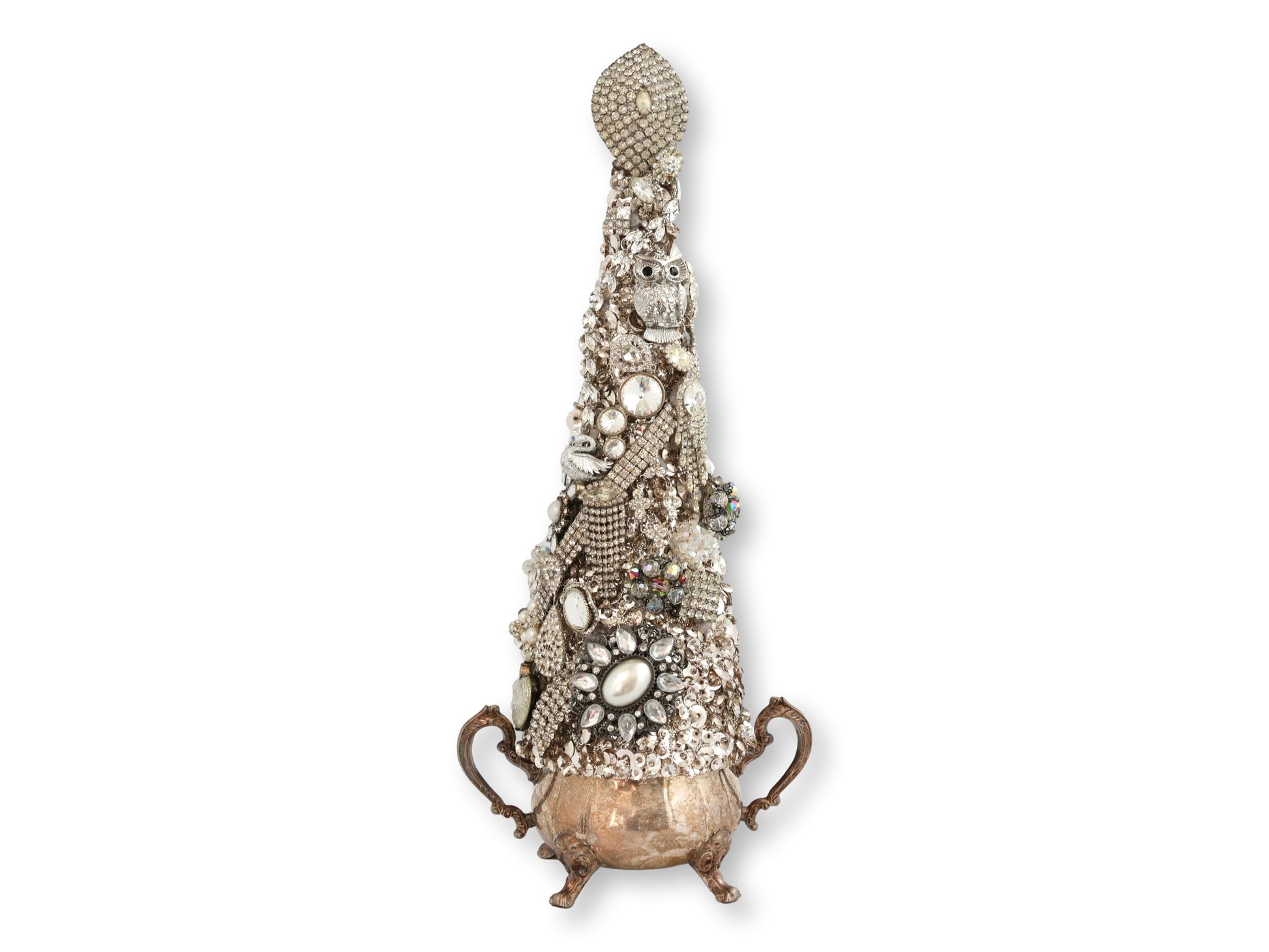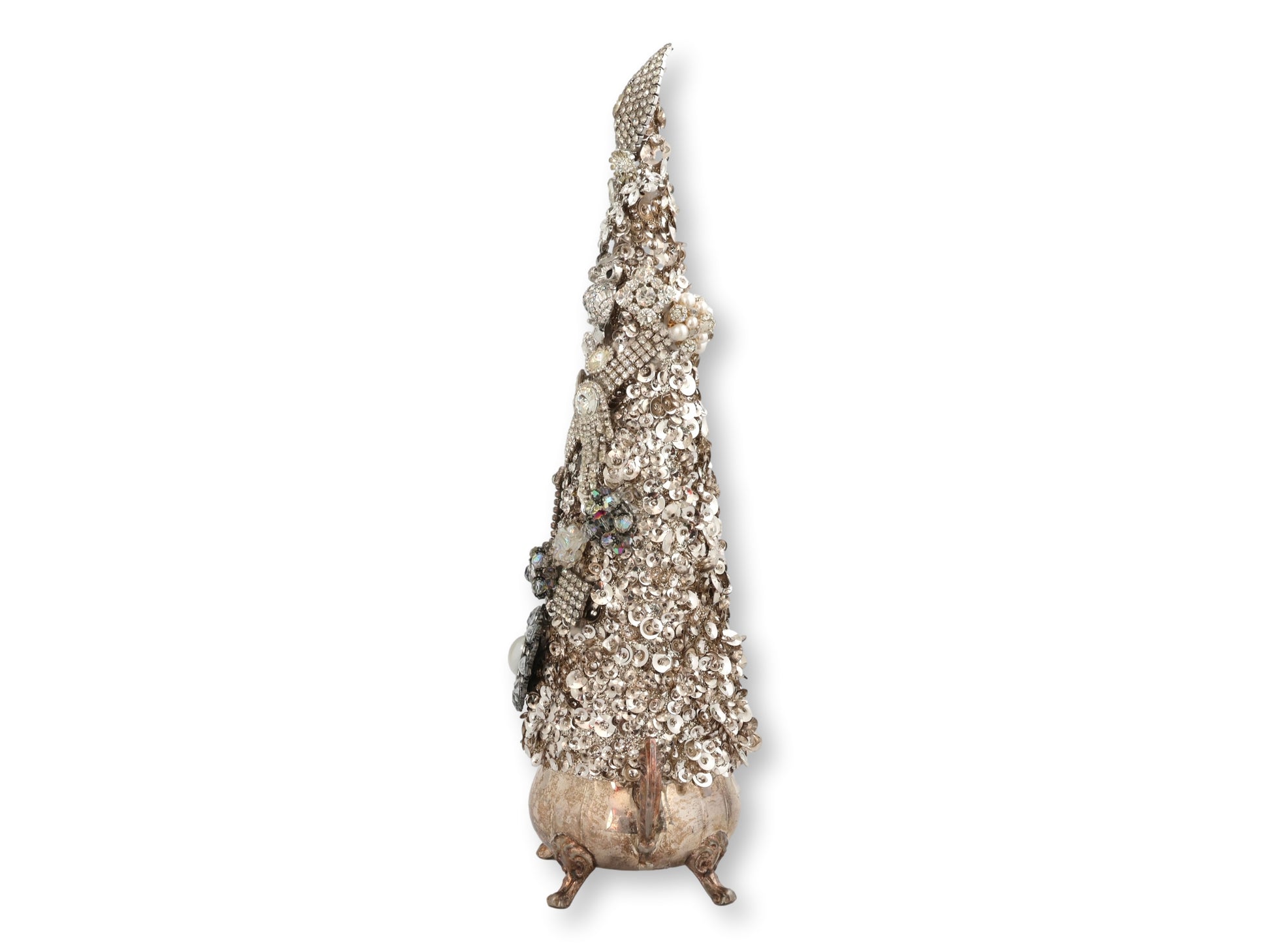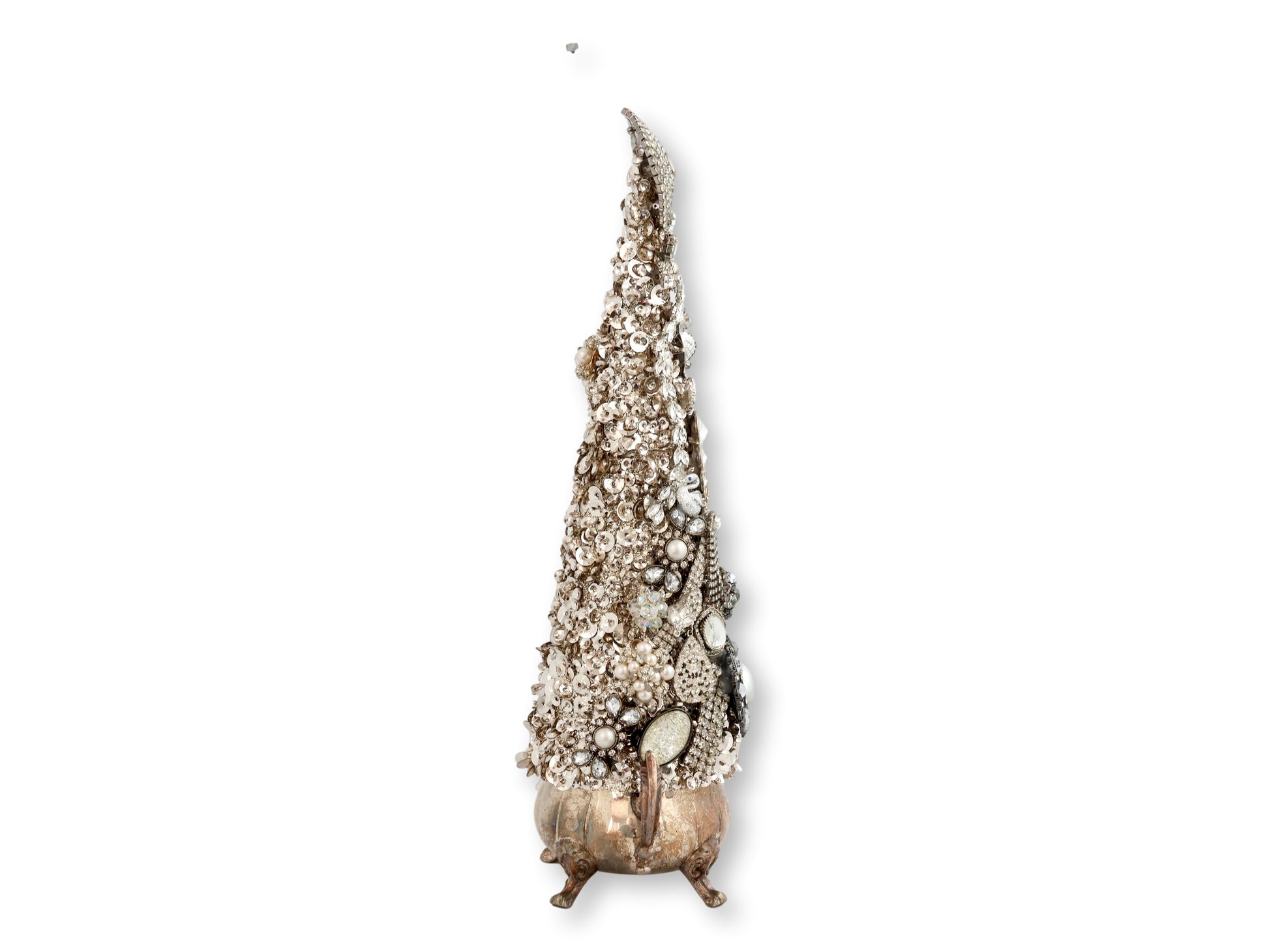 This jeweled holiday tree channels pure Hollywood glam. Rising from a vintage silverplate sugar bowl base, it shimmers with layers of rhinestones, faux pearls, pavé brooches, and glittering costume jewelry. A pavé teardrop finial crowns the top with couture drama, making it feel like a treasure from a midcentury starlet’s Beverly Hills home — or the kind of dazzling holiday gift she’d send to her best friend. One-of-a-kind, timeless, and unapologetically fabulous.