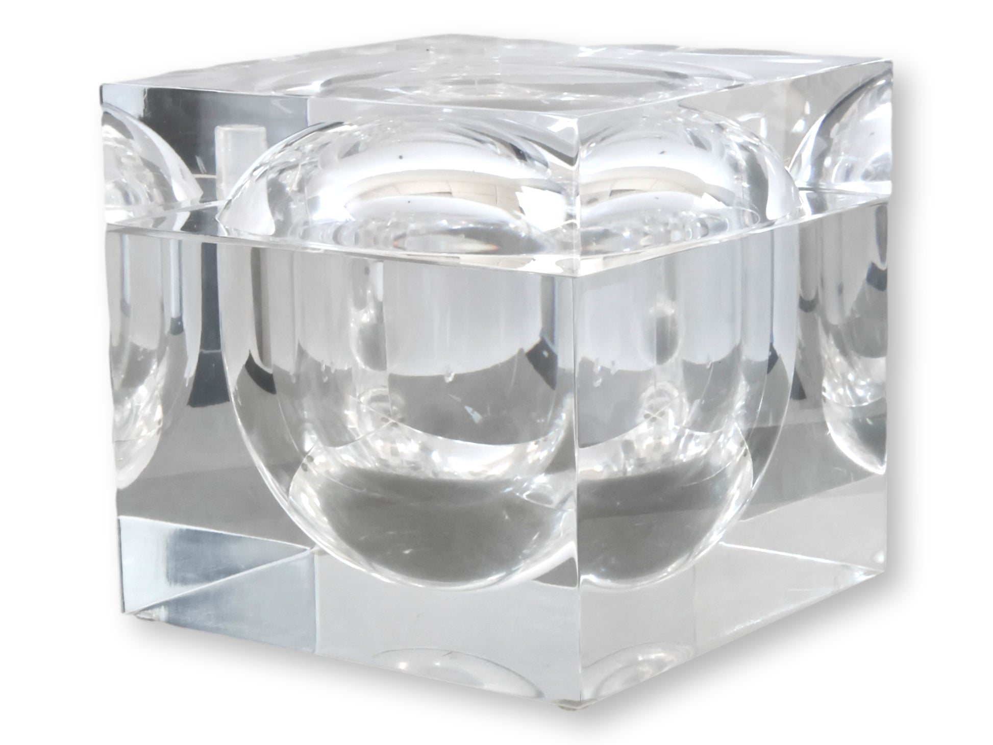 A sculptural Italian Lucite cube in the Albrizzi tradition, featuring thick, polished acrylic with an internal “ice block” illusion. The optical clarity and weight give this piece an architectural presence that transforms with light — part art object, part statement bar accessory. Exceptional craftsmanship and balance, unsigned and richly luminous from every angle.